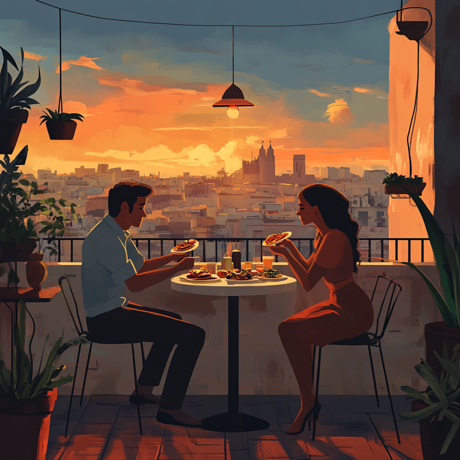 Romantic rooftop dinner at sunset with a cityscape view, featuring a couple enjoying a meal together.