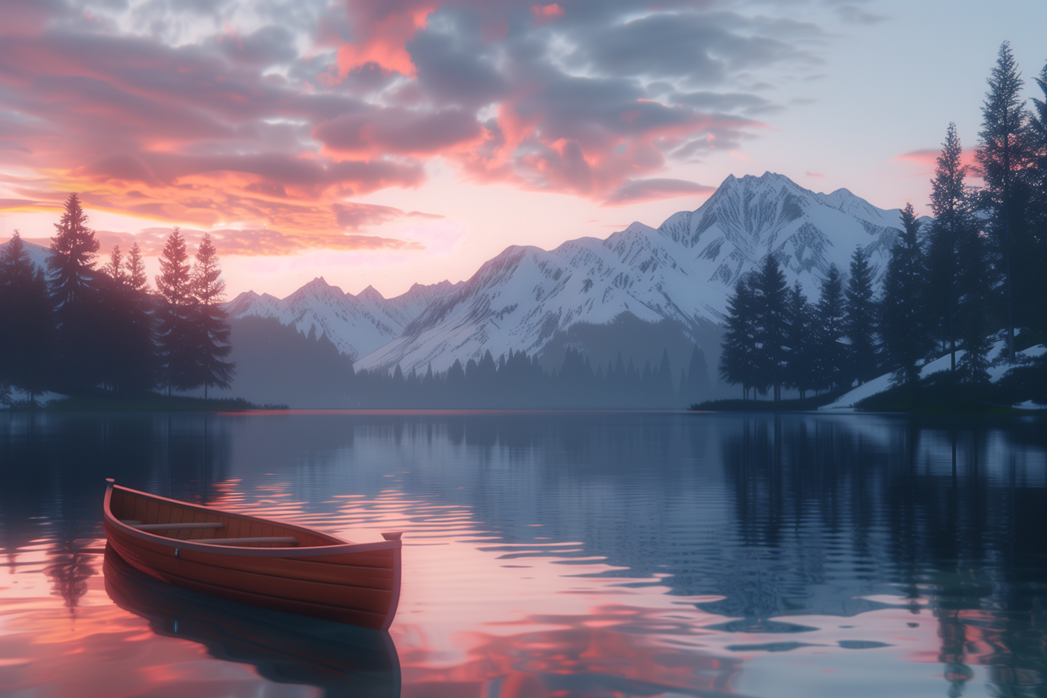 Tranquil lake at sunset with a wooden canoe, snow-capped mountains, and vibrant pink-orange sky reflections.