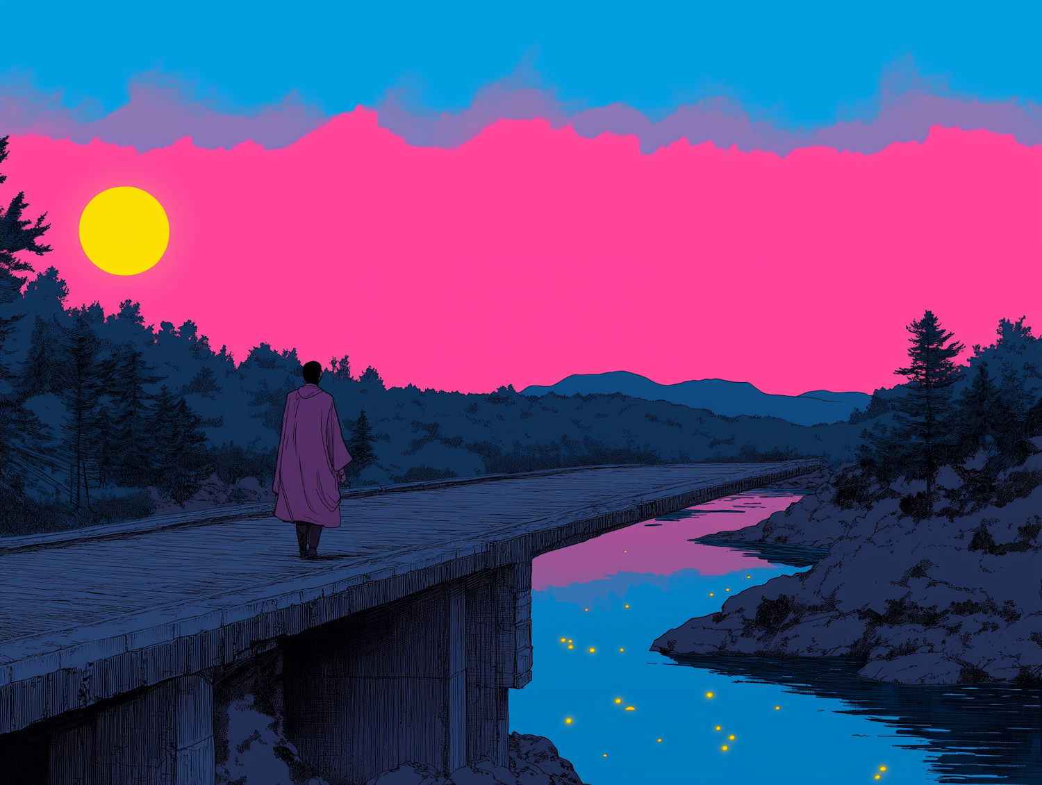 A solitary figure in a pink cloak stands on a bridge at sunset, surrounded by vibrant pink and blue skies and a tranquil river.