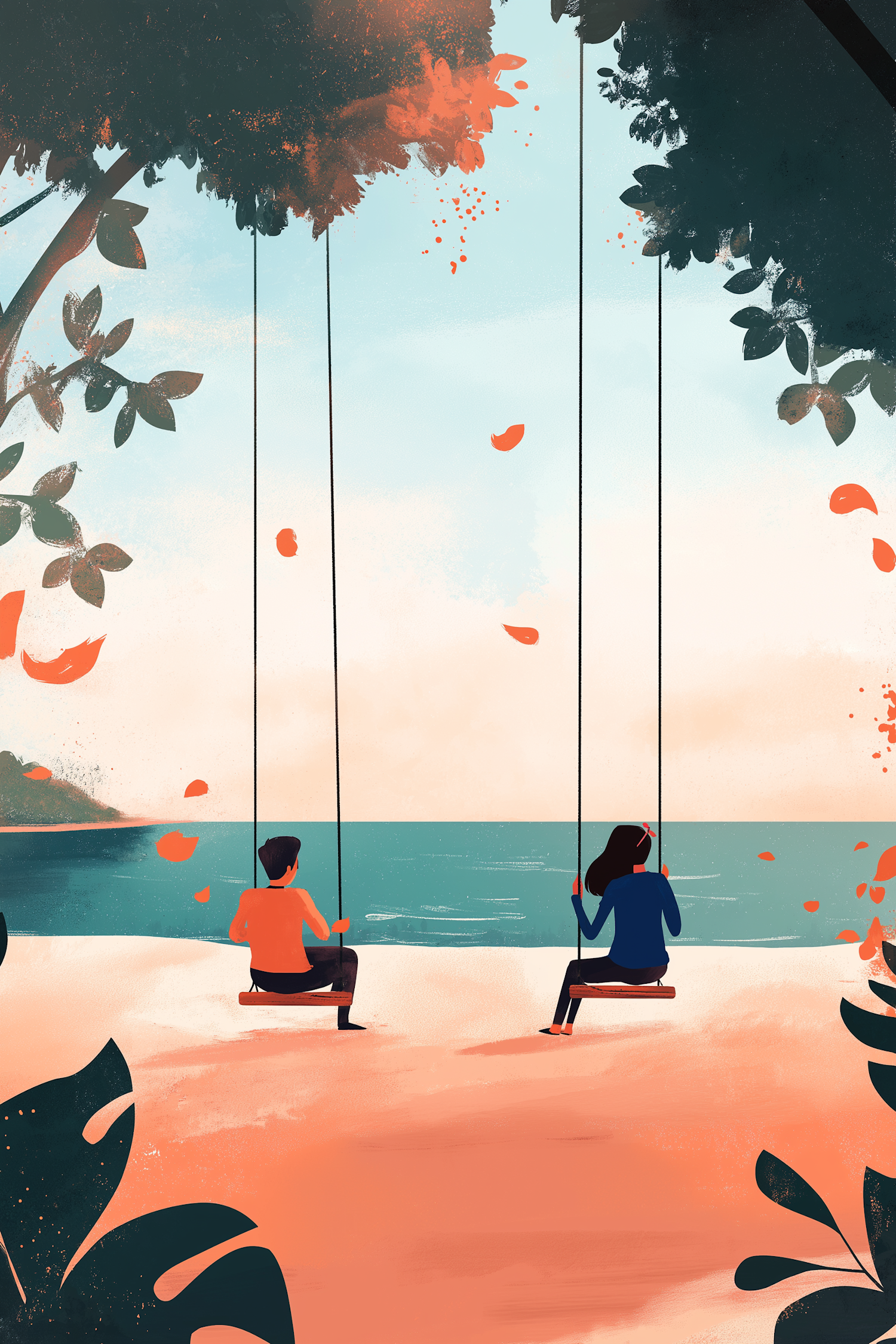 Illustration of two people on swings by the ocean, surrounded by trees and falling leaves, in a serene beach setting.
