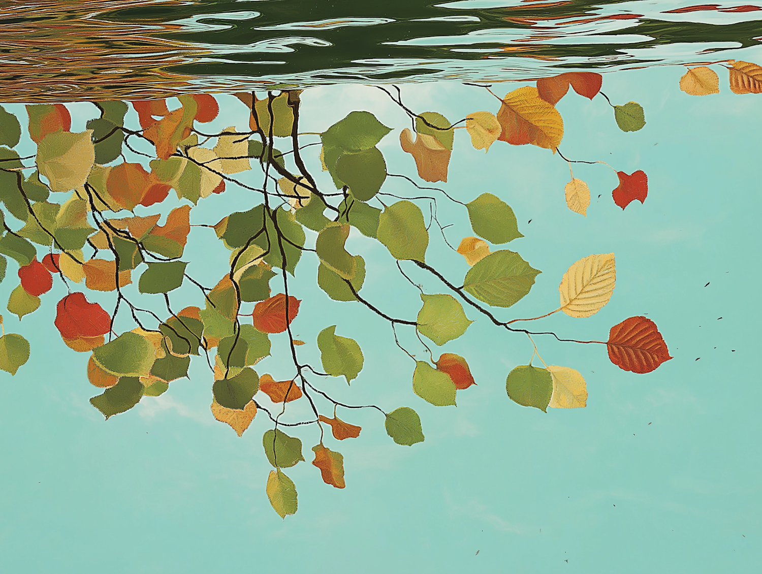 Vibrant autumn leaves reflected in water, creating a serene and colorful scene with green, yellow, orange, and red hues.