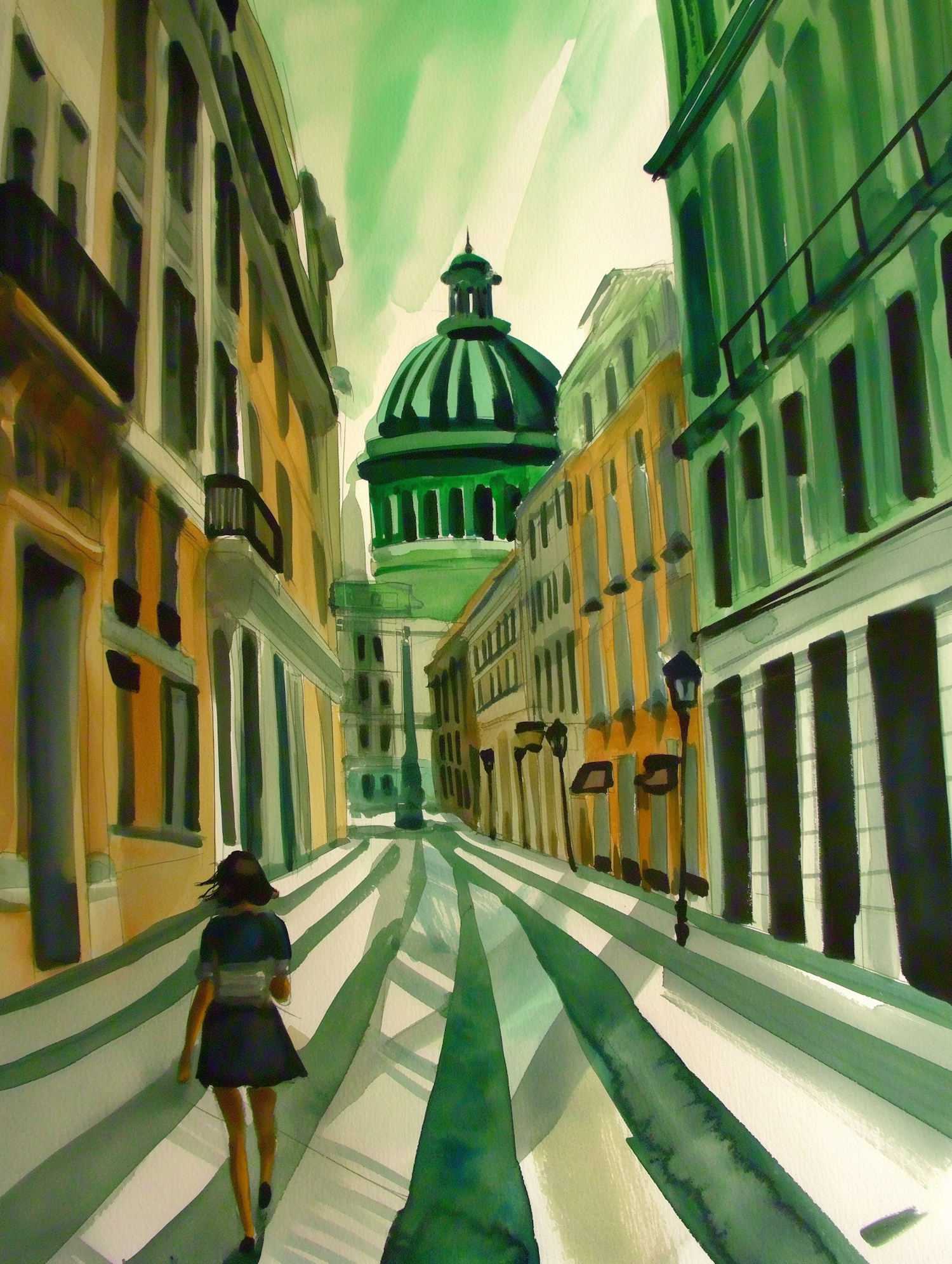 Watercolor cityscape with a domed building, vibrant greens and yellows, and a lone figure walking down the street.