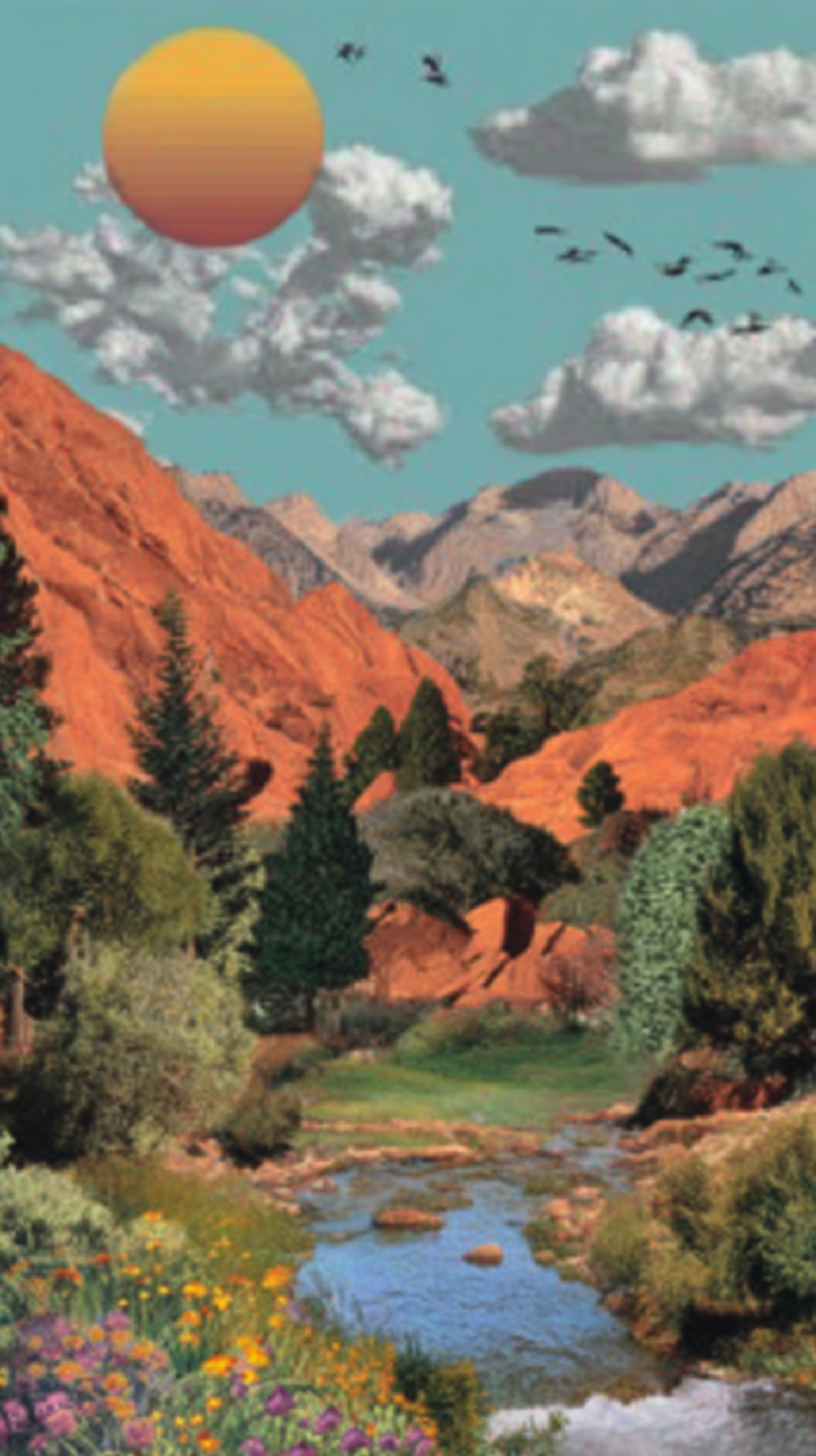 A colorful illustration of a serene valley with a stream, red rock formations, and a bright sun in a clear sky with birds flying.