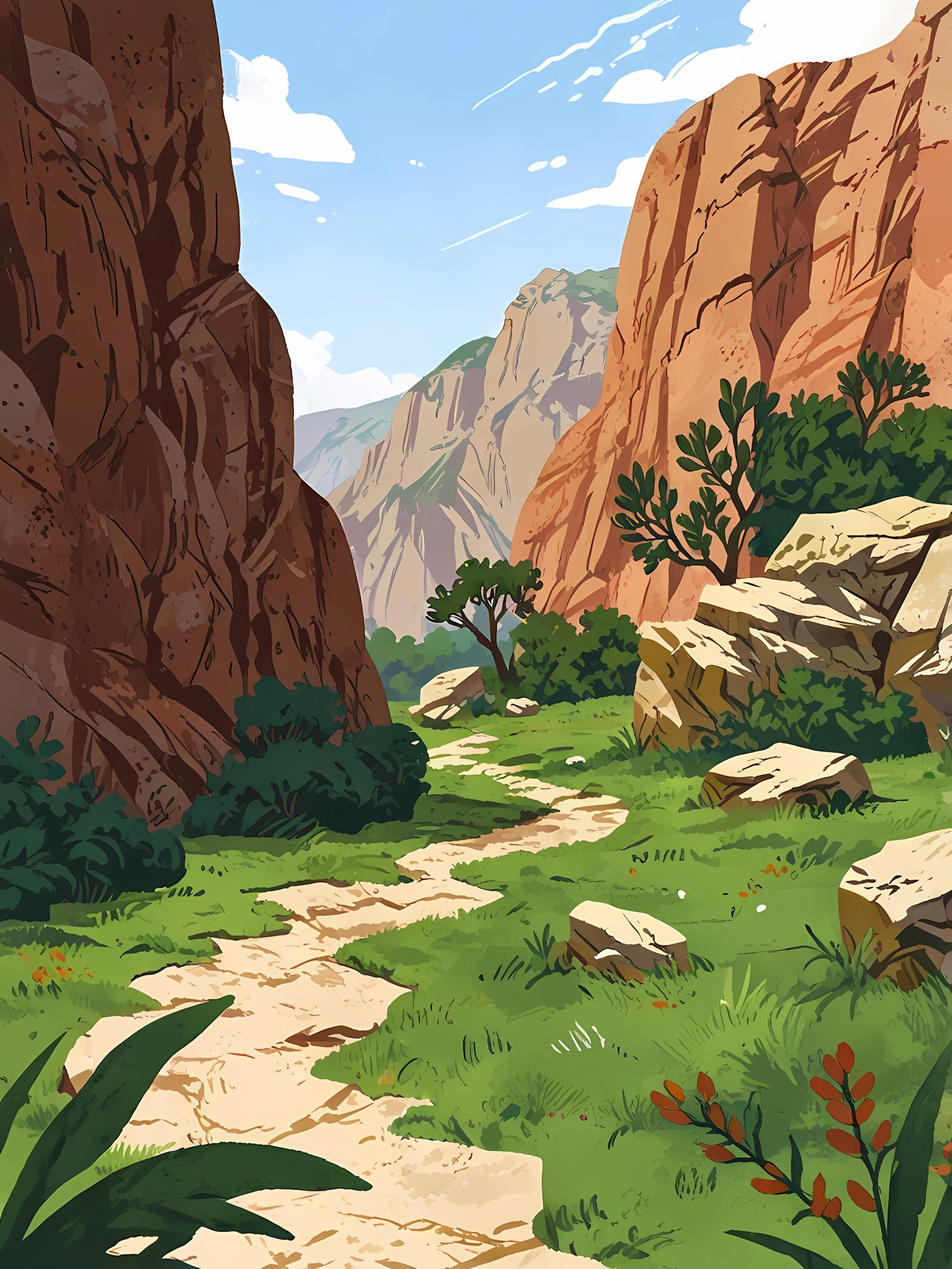 Illustrated canyon path with lush greenery and towering cliffs under a clear blue sky, evoking a serene and inviting atmosphere.