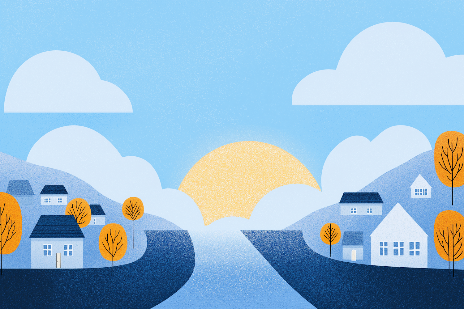 Charming village illustration with a river, orange trees, and a glowing sun. Perfectly serene and minimalistic design.
