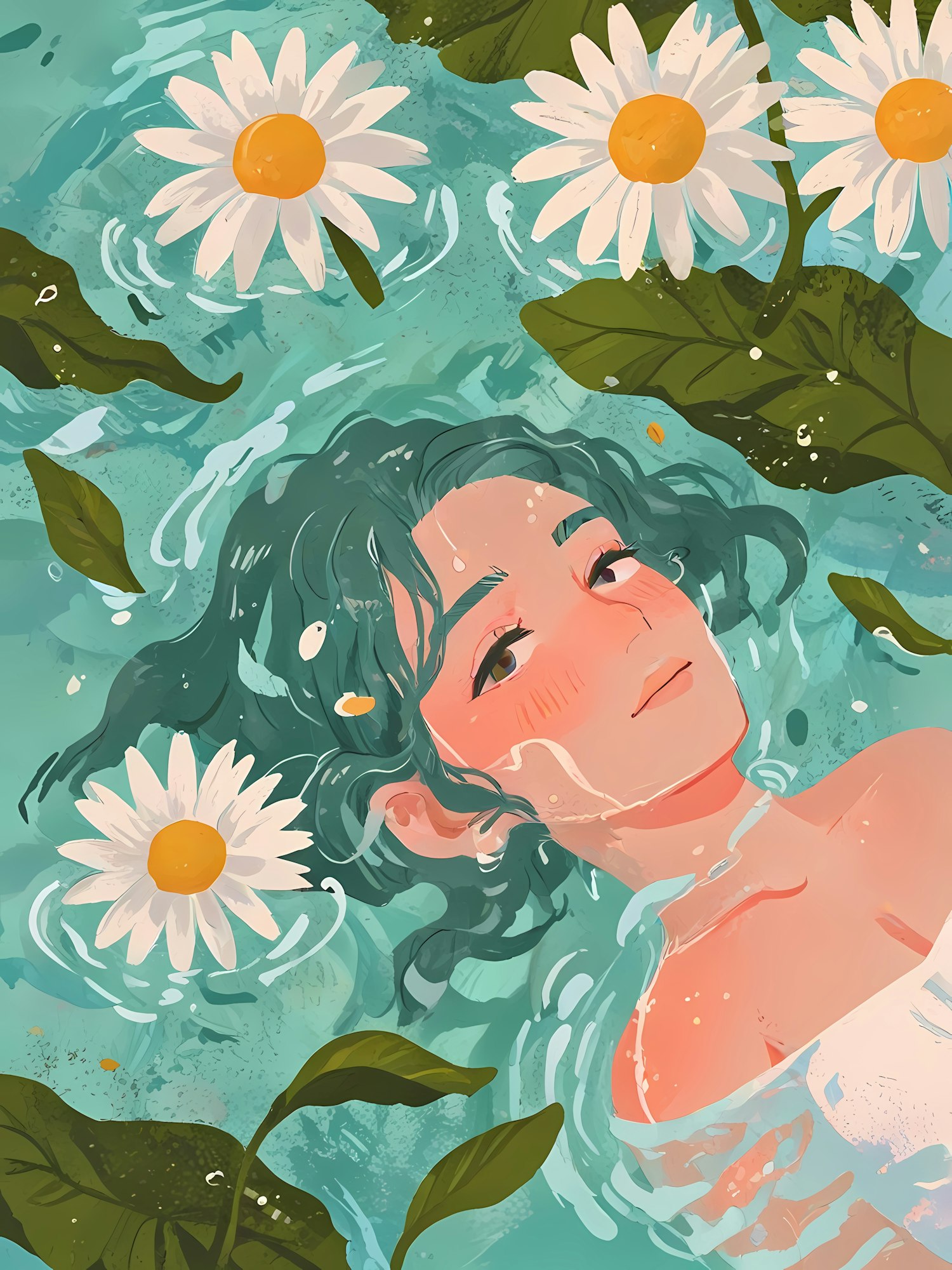 Illustration of a serene woman with teal hair floating among daisies in tranquil turquoise water, evoking a dreamy, peaceful atmosphere.