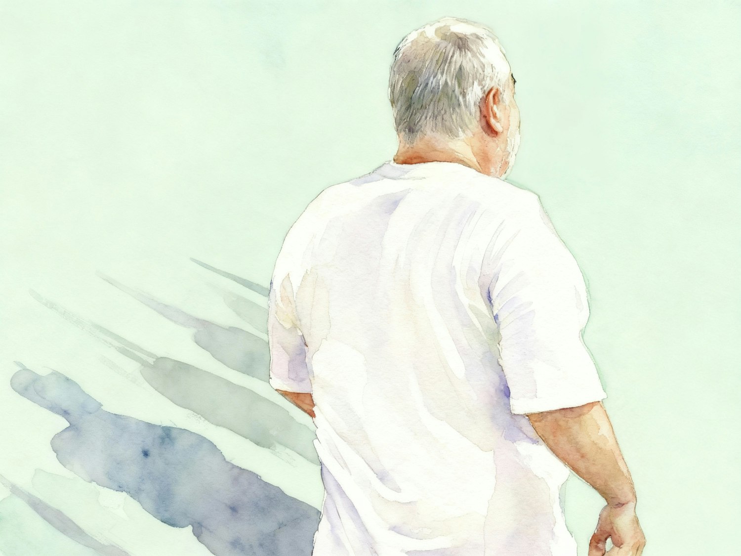 Watercolor-style illustration of a man in a white shirt with a soft green background and blue-gray shadows, evoking a serene atmosphere.