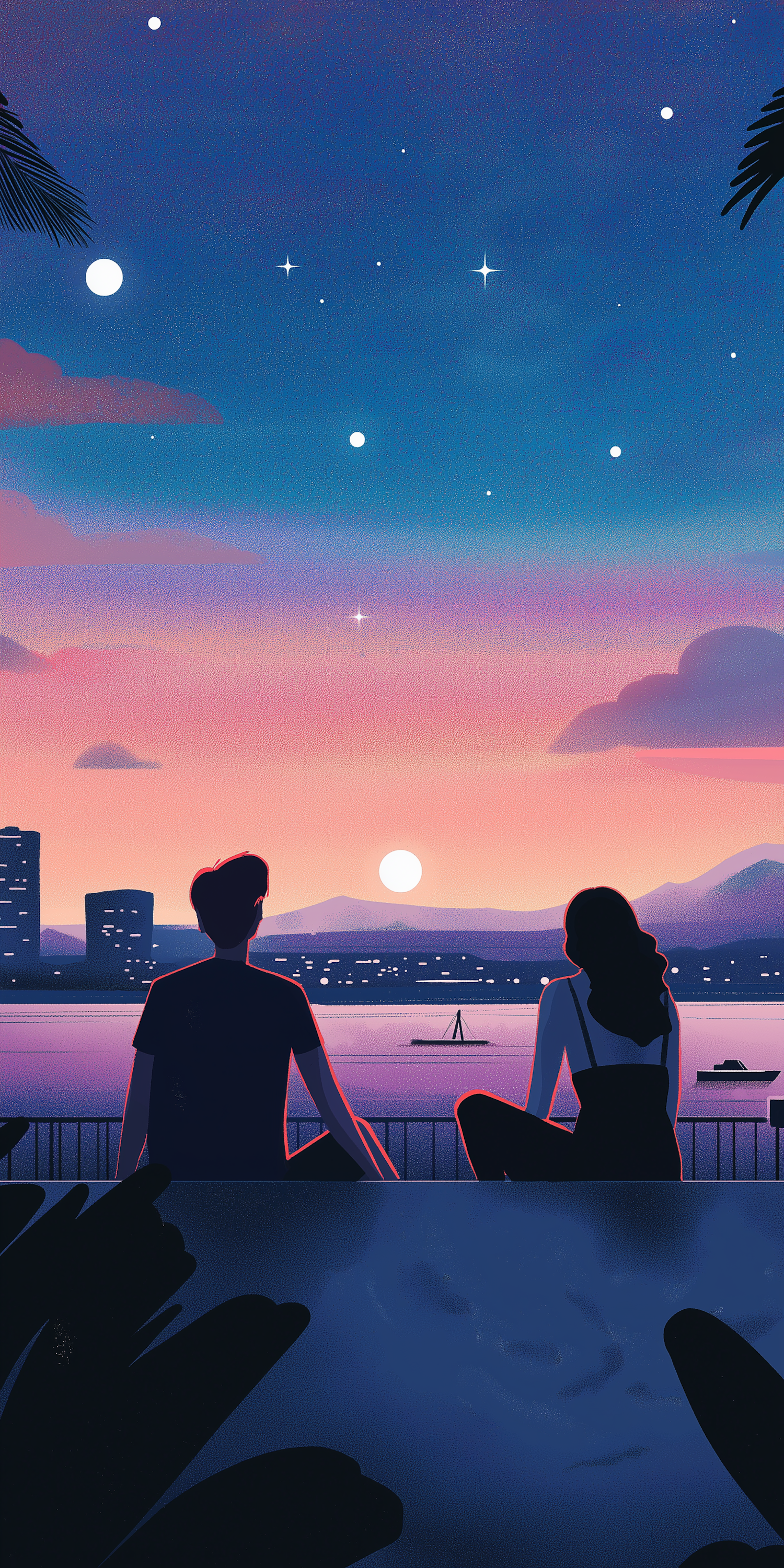 Silhouetted couple enjoys a serene sunset over a cityscape with stars and a sailboat on calm waters.