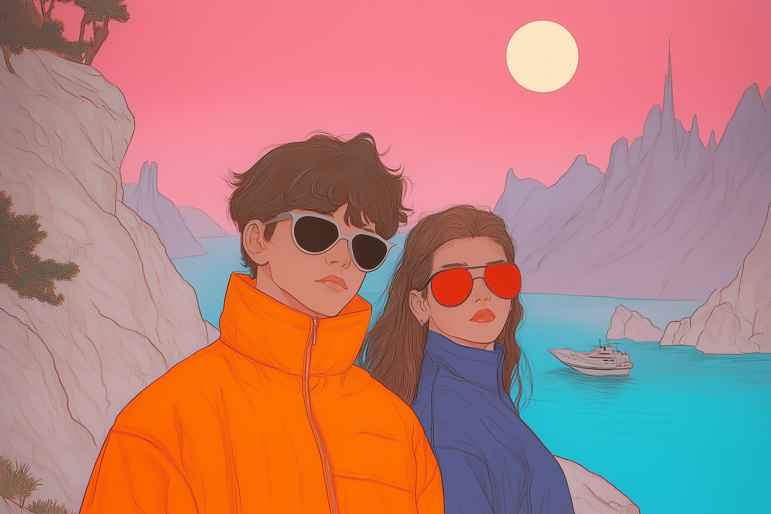 Stylized illustration of two people in vibrant jackets and sunglasses, set against a surreal pink sky and turquoise sea.