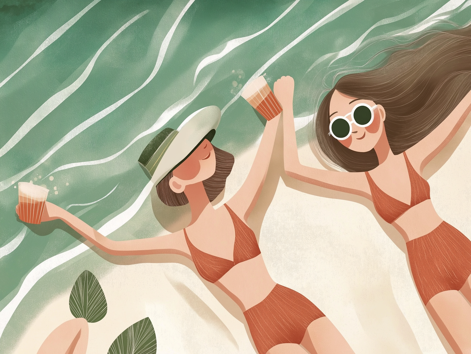 Two women in red swimsuits relax on a beach, holding drinks. One wears a hat, the other sunglasses, with green waves in the background.