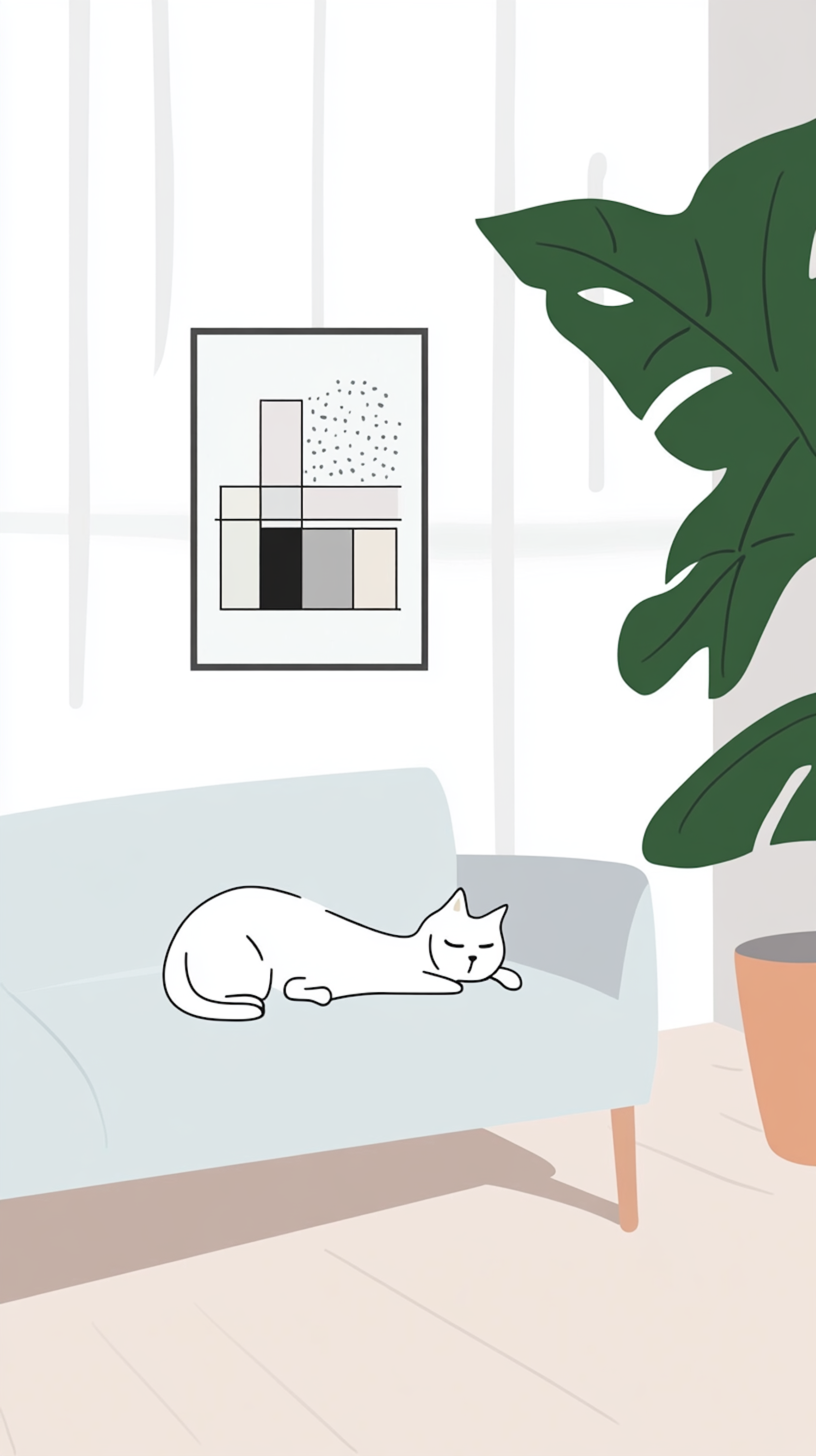Minimalist illustration of a white cat sleeping on a light blue sofa in a bright room with a large plant and abstract art.