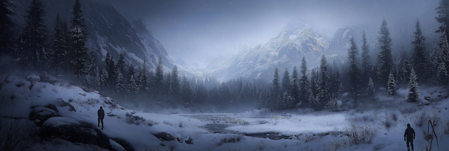 A tranquil winter scene with snowy mountains, pine trees, a frozen river, and two figures exploring the serene landscape.
