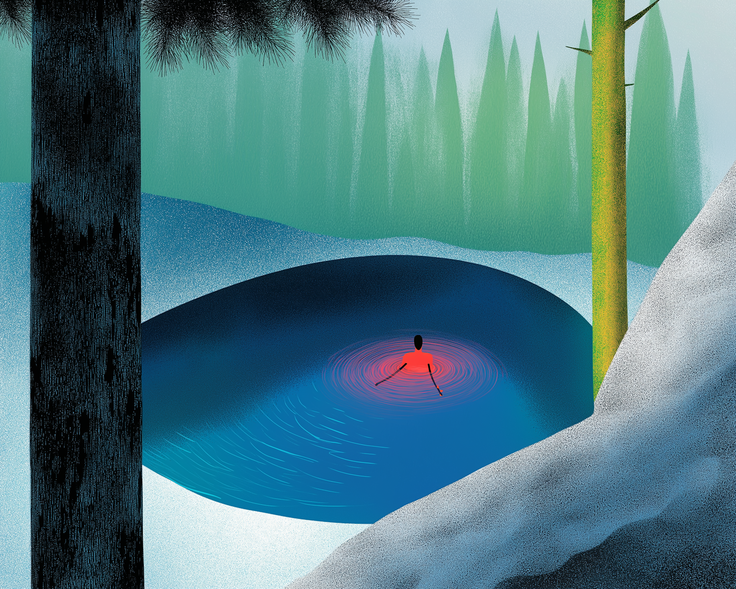 A person in red swims in a blue pond surrounded by snow and trees, creating a serene winter scene.