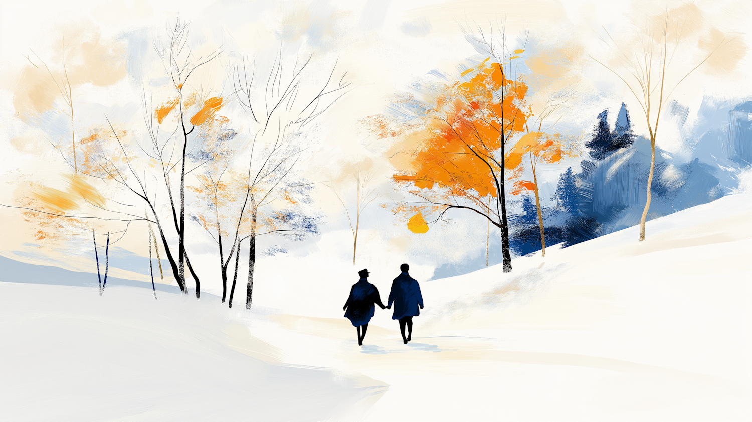 Two figures walk hand in hand through a snowy landscape with bare trees and orange leaves, creating a serene winter scene.