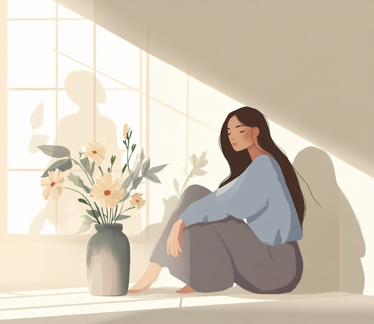 Serene illustration of a woman sitting by a window with flowers, bathed in soft sunlight. Tranquil and contemplative atmosphere.