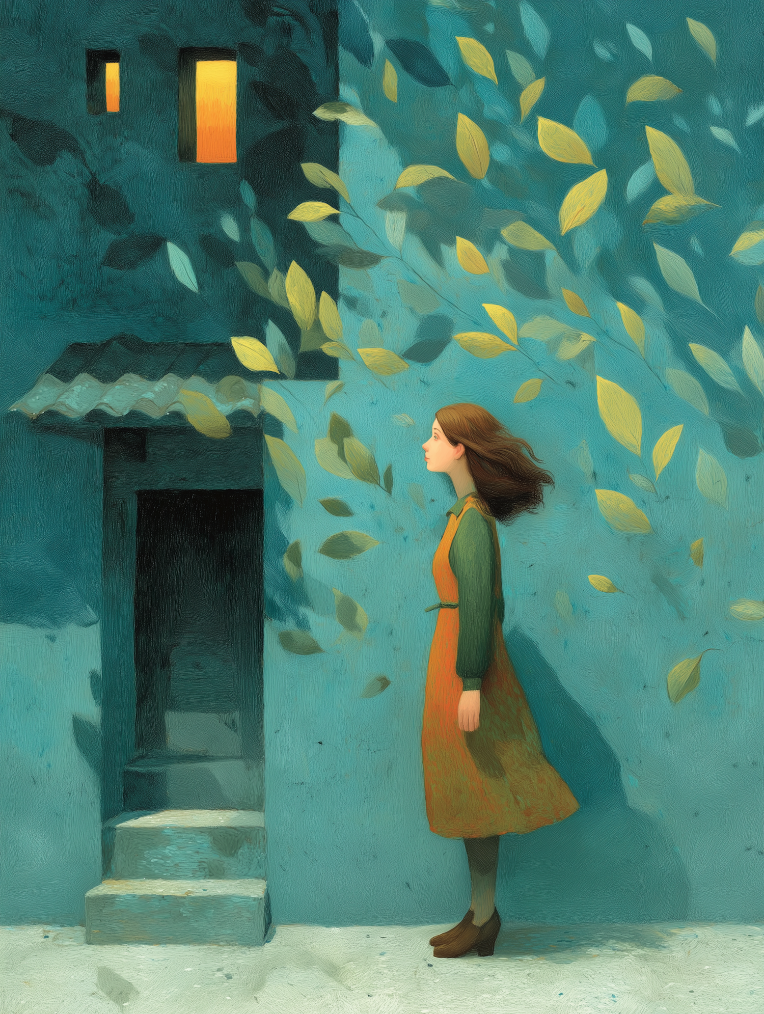 A woman in an orange dress stands by a blue wall with yellow leaves and glowing windows, creating a serene and artistic scene.