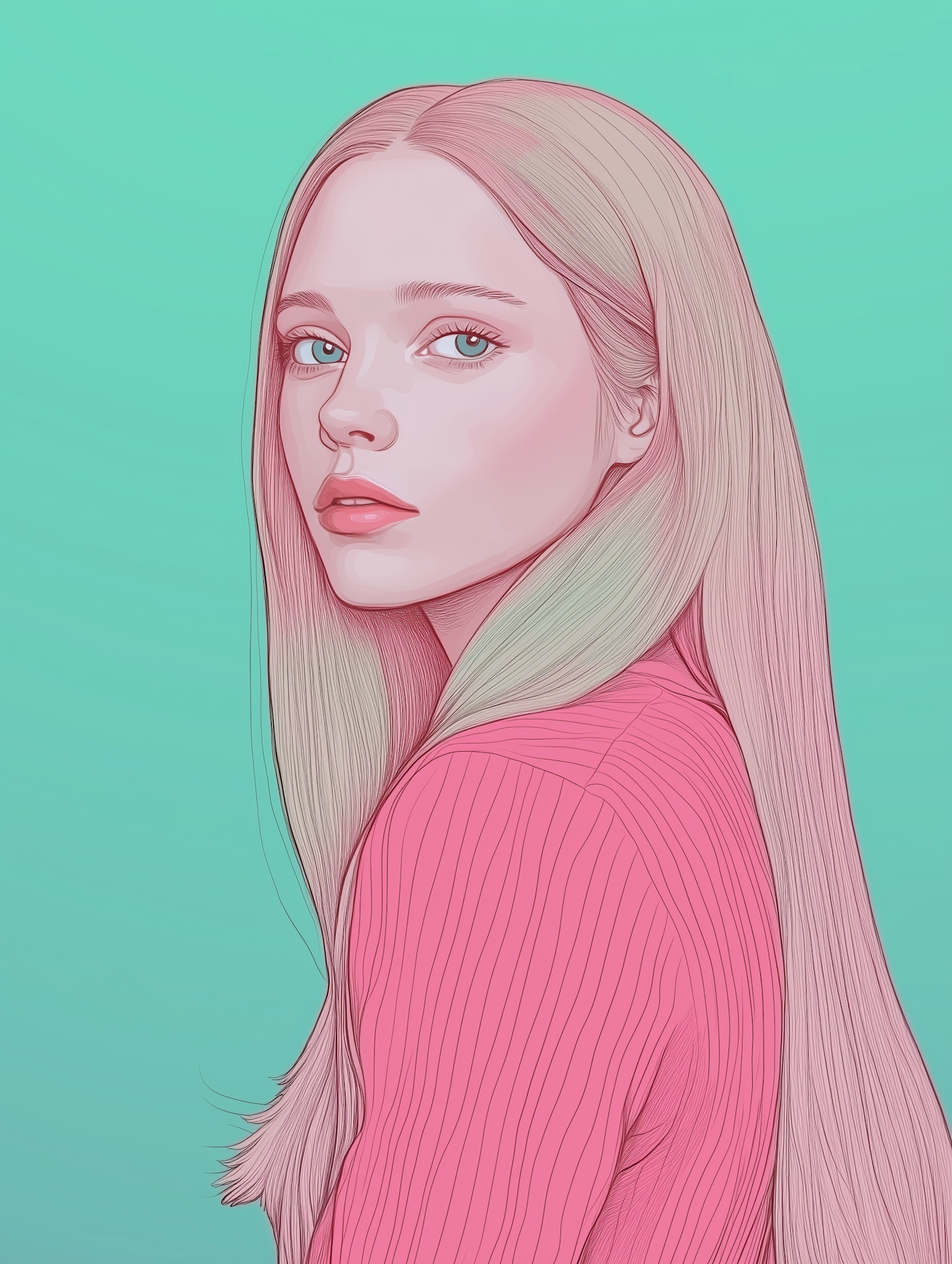 Digital illustration of a serene young woman with blonde hair and blue eyes, wearing a pink top against a turquoise background.