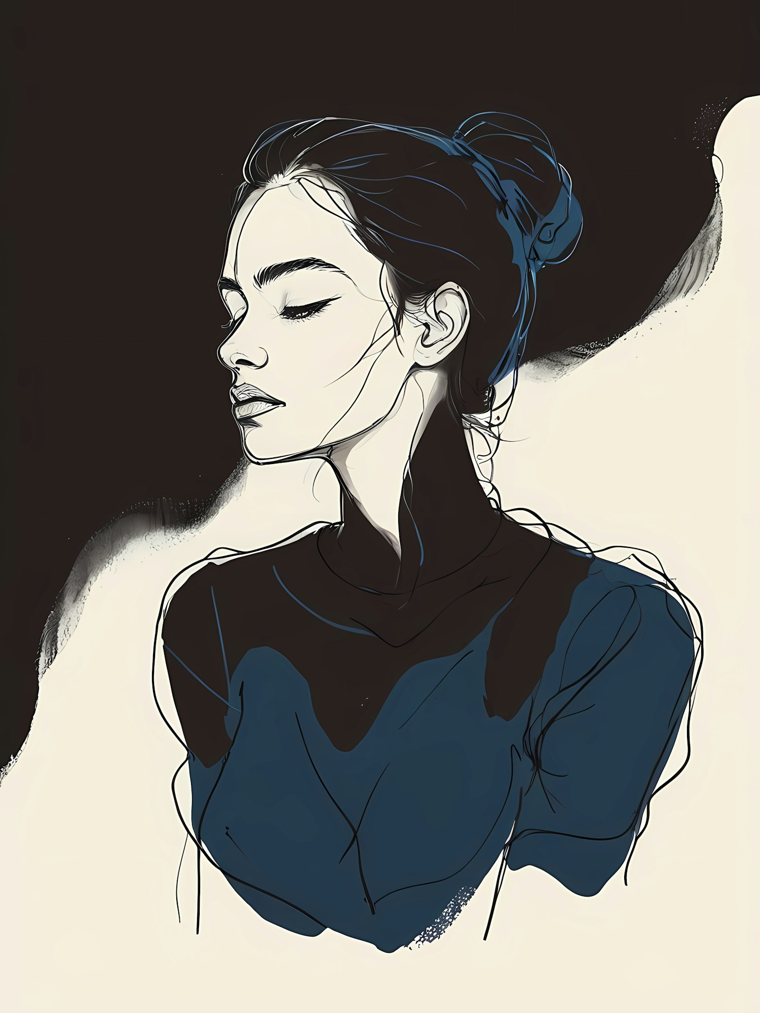 Stylized illustration of a serene woman with dark hair in a bun, using a limited palette of blues and blacks.