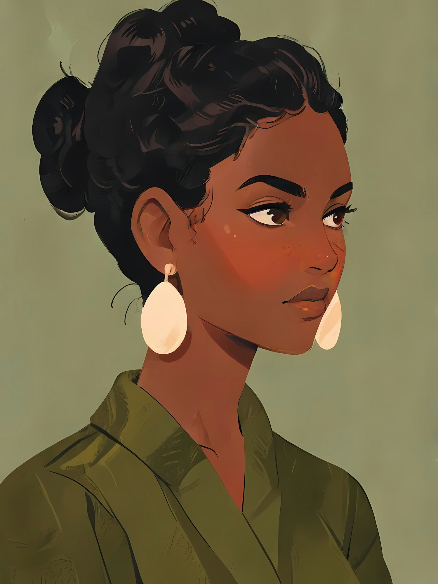 Elegant digital illustration of a woman with dark skin, an updo hairstyle, white earrings, and a green outfit against a soft green background.