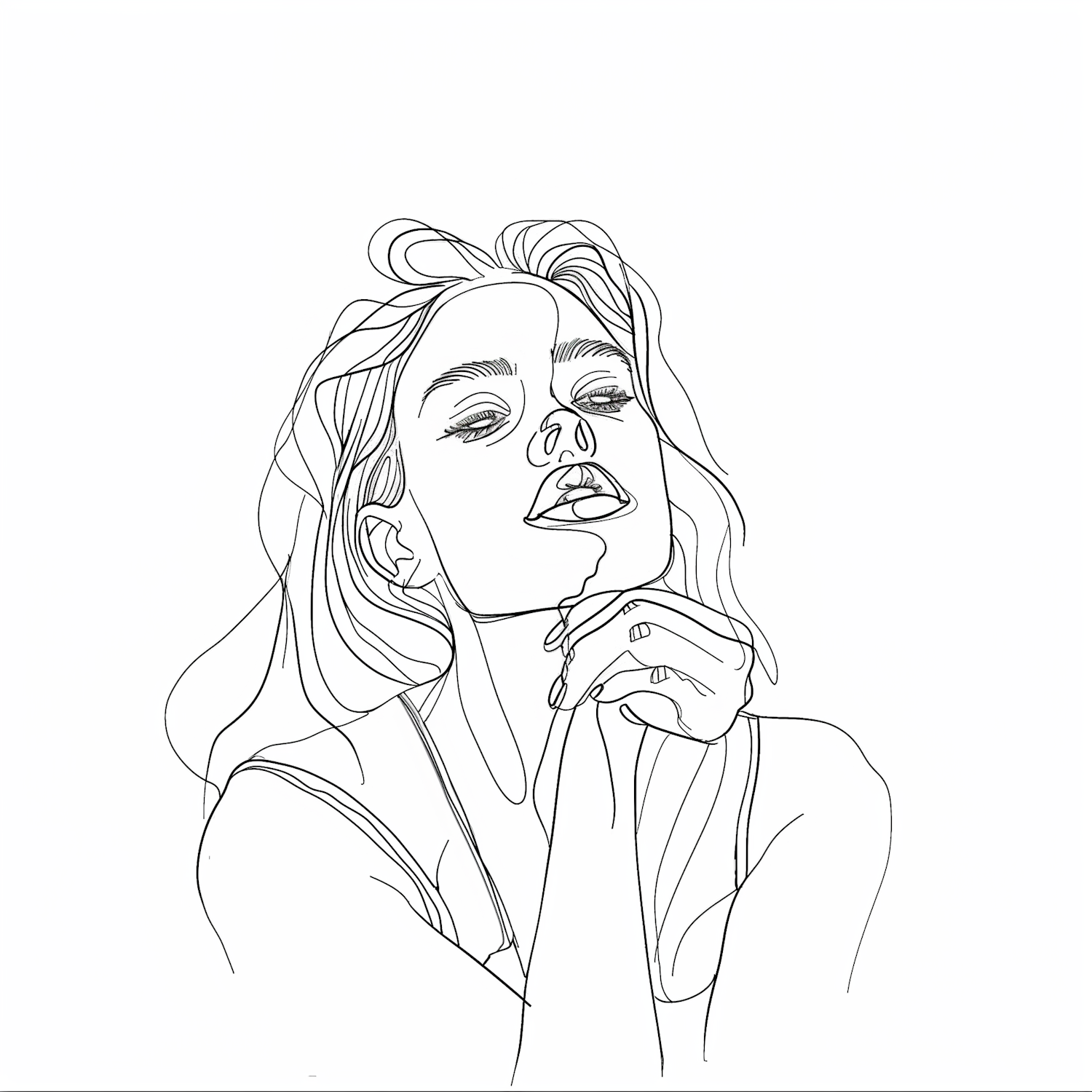 Minimalist line drawing of a serene woman with long hair, eyes closed, and hands clasped under her chin. Simple and elegant design.