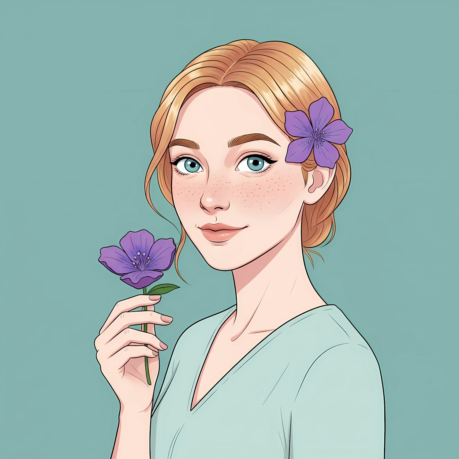 A beautiful digital illustration of a young woman holding a purple flower, with a serene expression and a teal background.