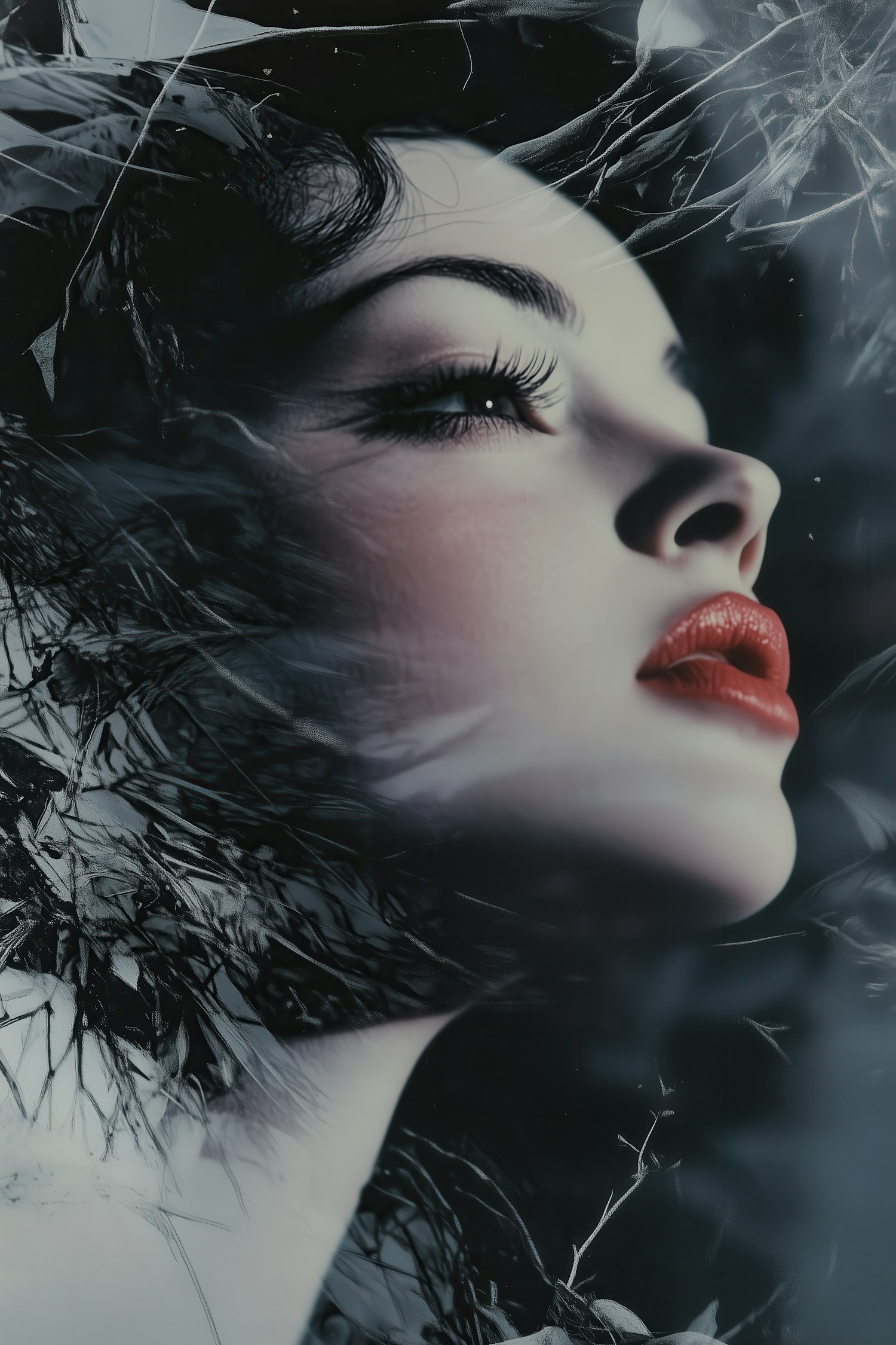Elegant close-up portrait of a woman with bold red lips and dark hair, set against an abstract, swirling background.