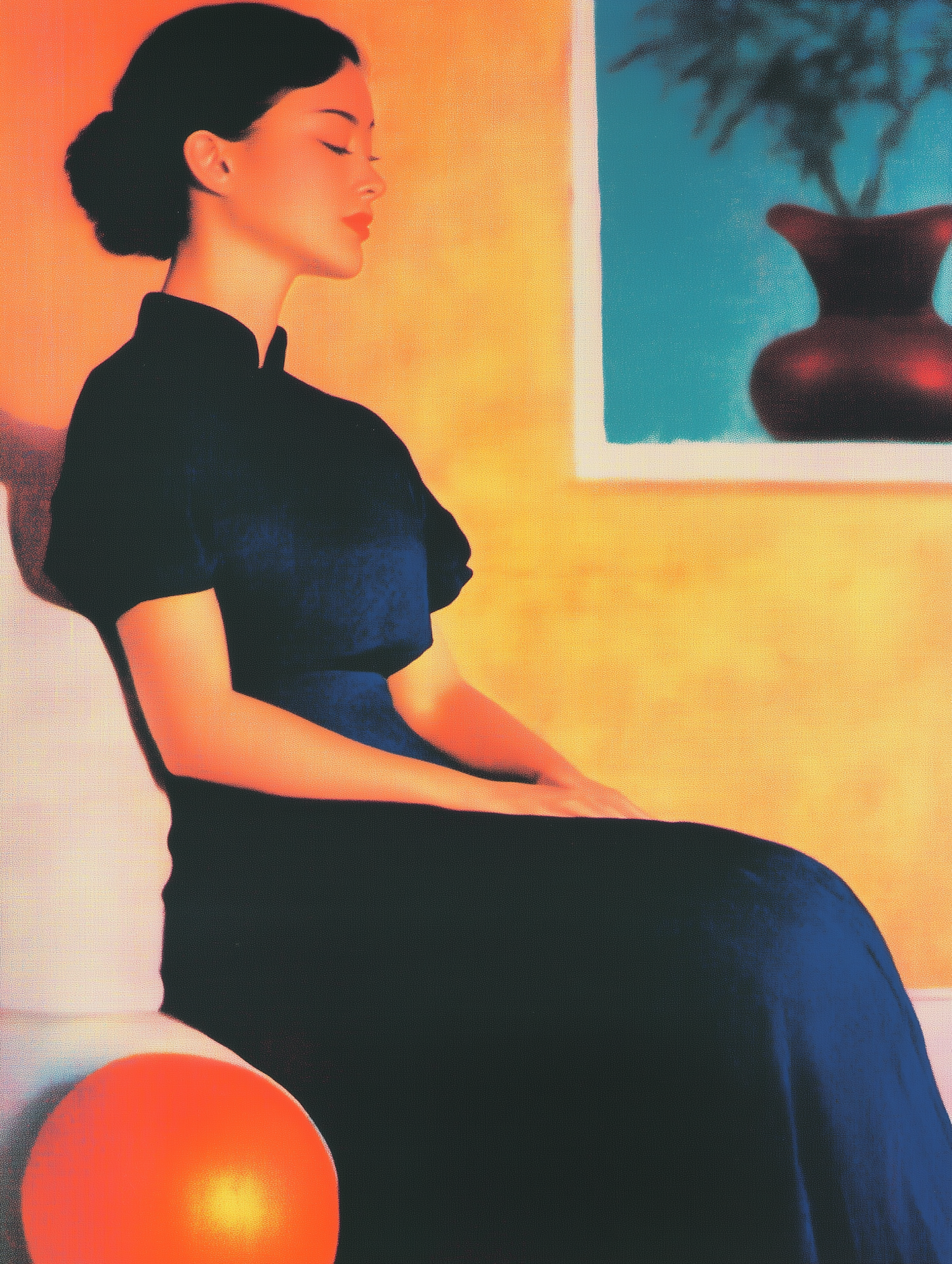 Elegant illustration of a woman in a blue dress, seated in profile against a warm yellow background with a red vase artwork.