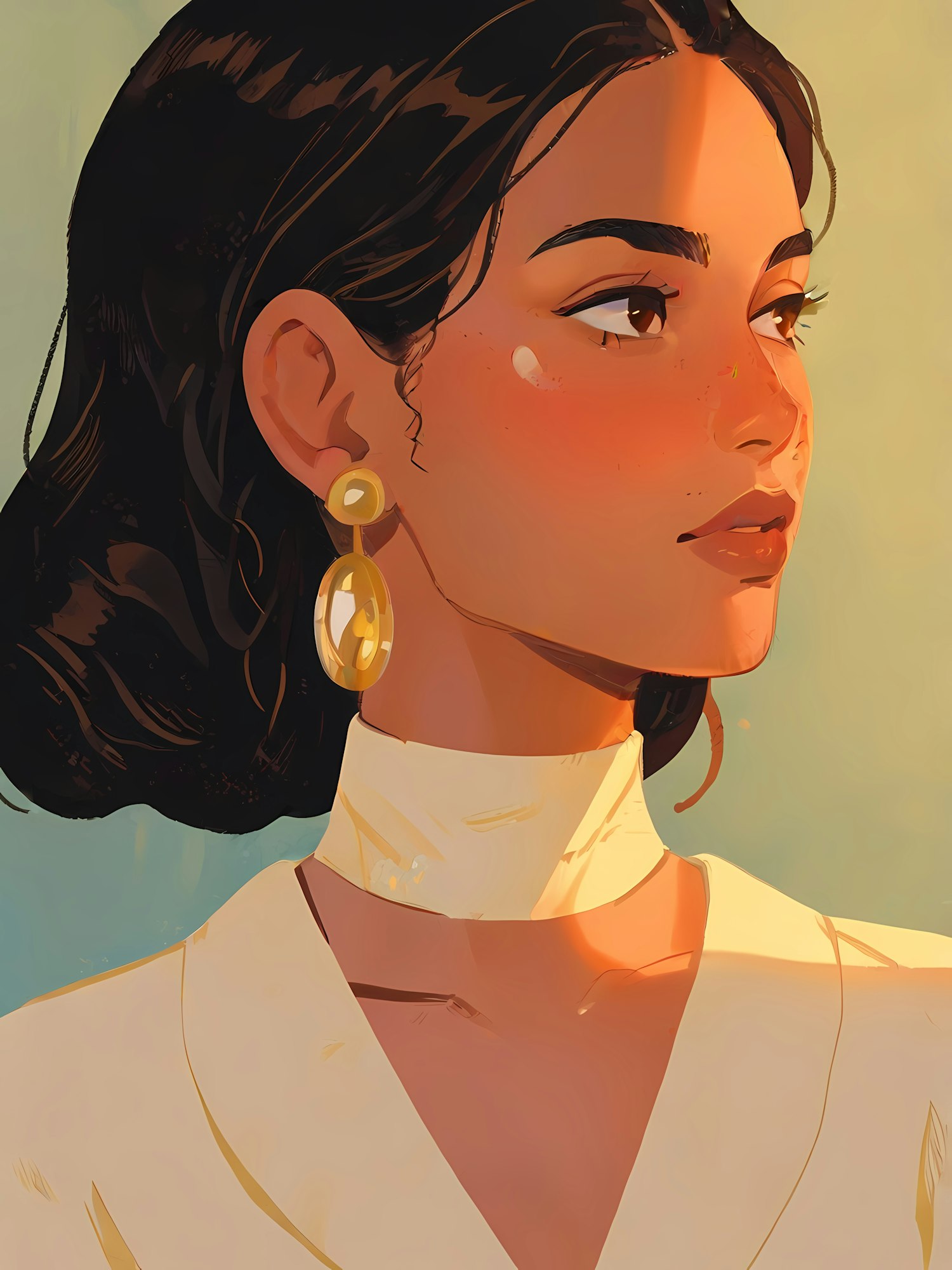 Elegant digital illustration of a woman with dark hair, gold earrings, and a cream outfit against a soft green-yellow background.