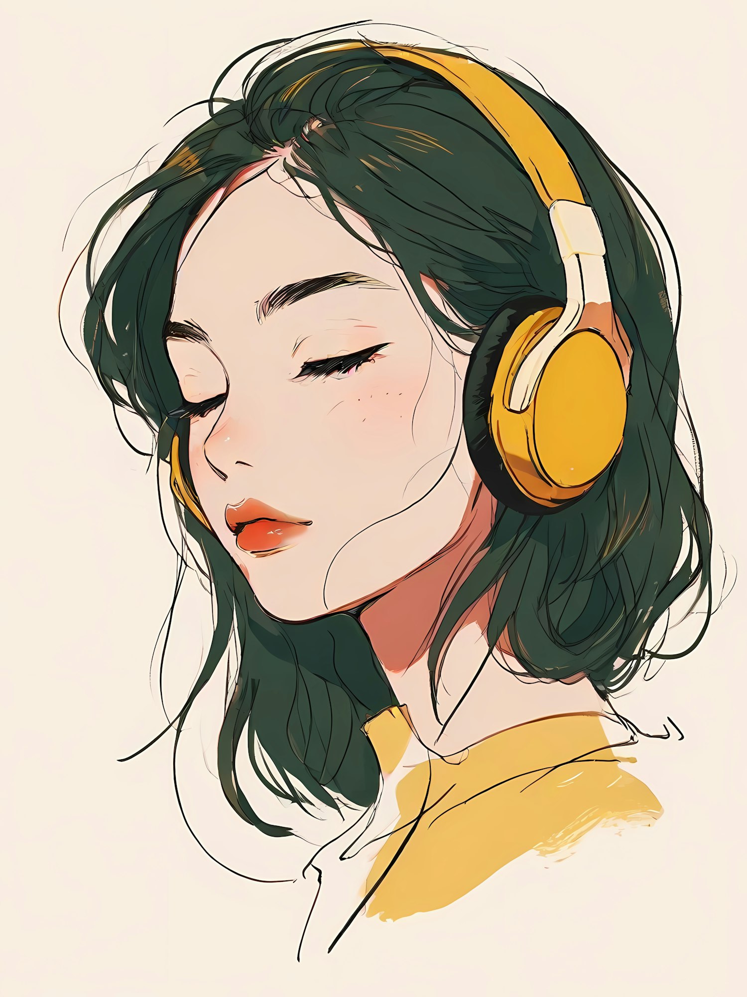 Minimalist illustration of a serene woman with green hair, yellow headphones, and a matching top on a soft beige background.