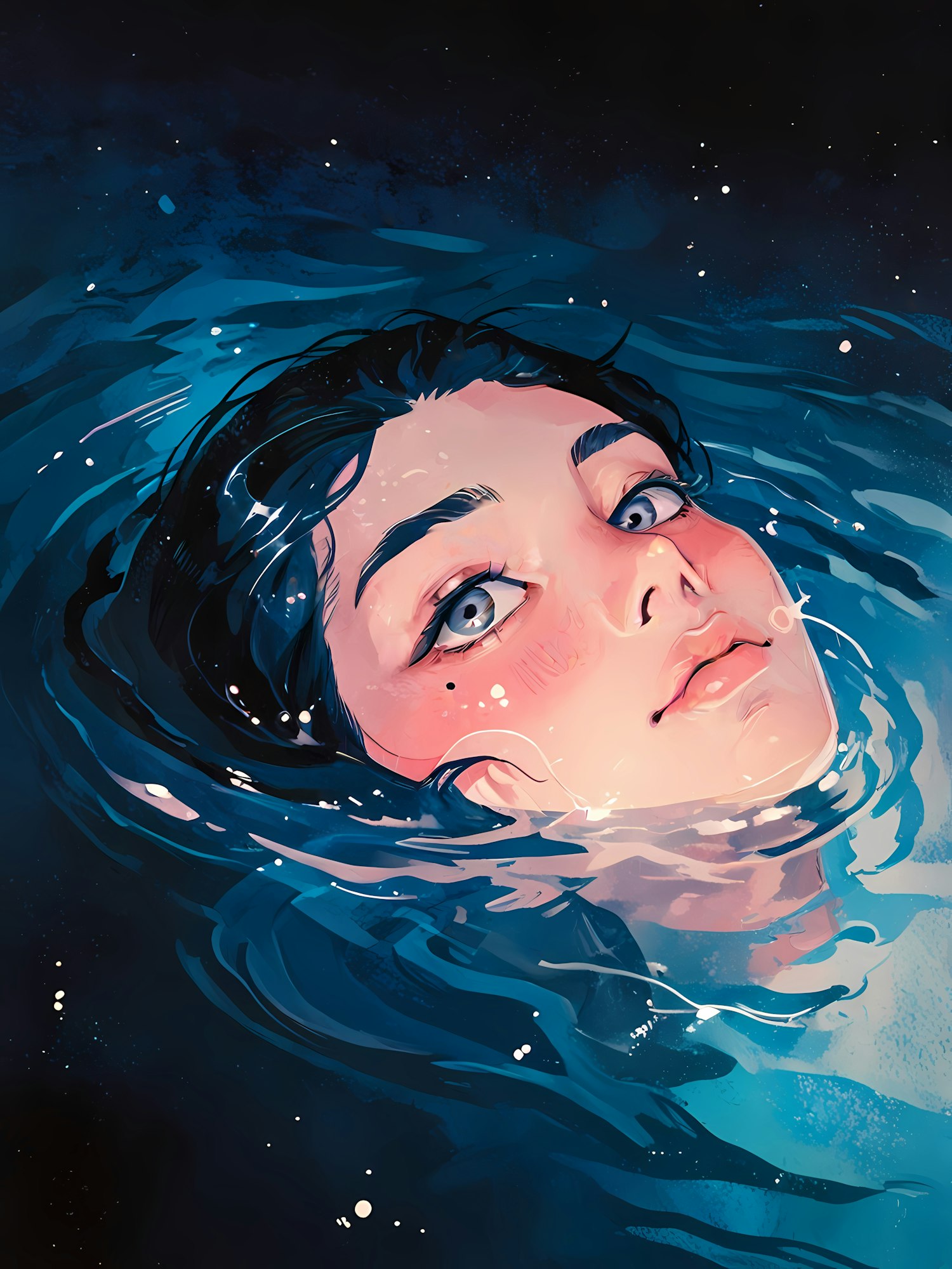Illustration of a woman's face in water, with blue eyes and dark hair, surrounded by swirling blues and whites, creating a dreamy effect.