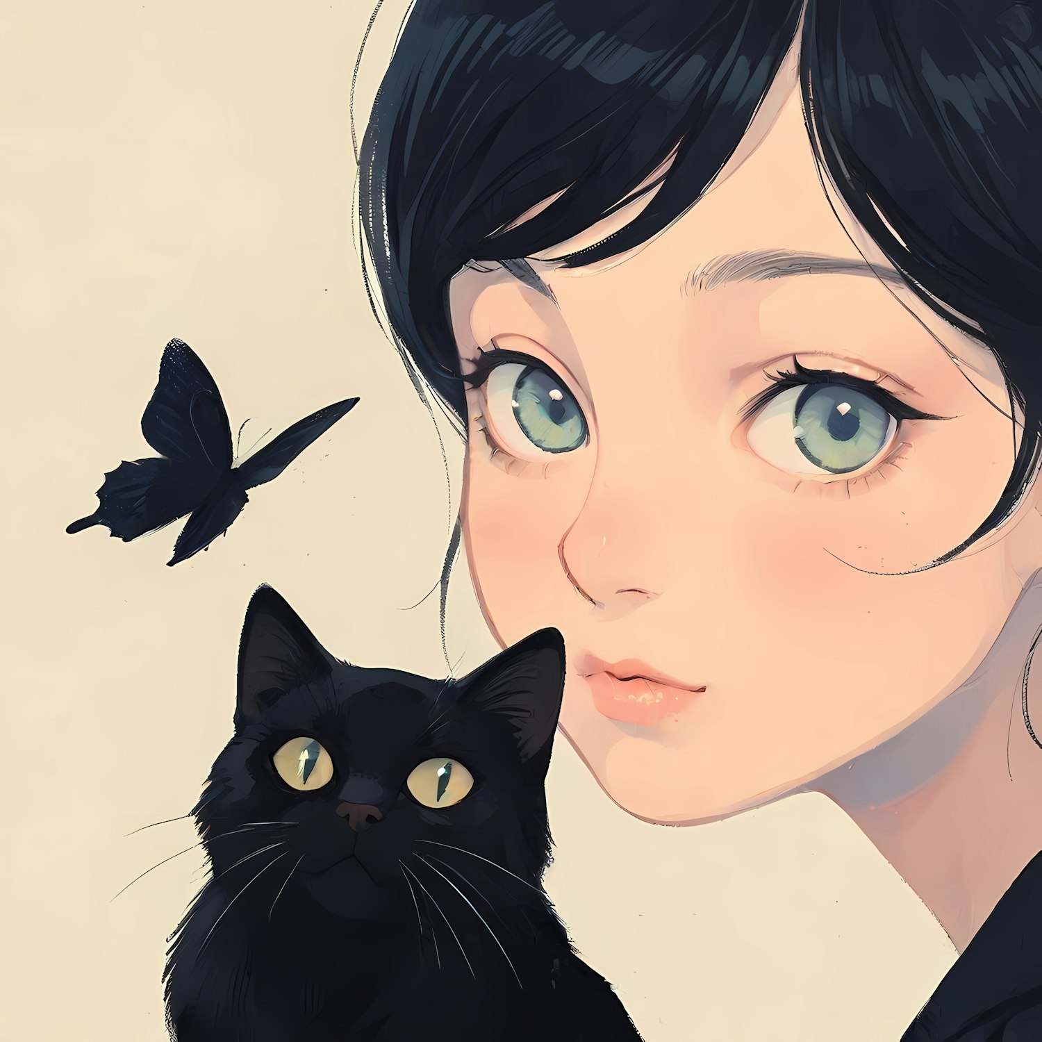 Whimsical illustration of a girl with blue eyes, a black cat, and a butterfly. Soft colors and serene expressions create a magical atmosphere.