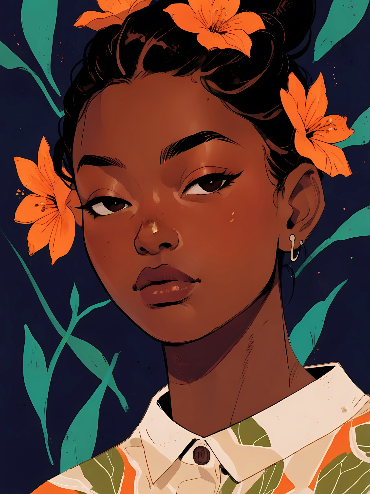 Illustration of a woman with orange flowers in her hair, wearing a floral shirt. Deep blue background with green leaves adds artistic flair.