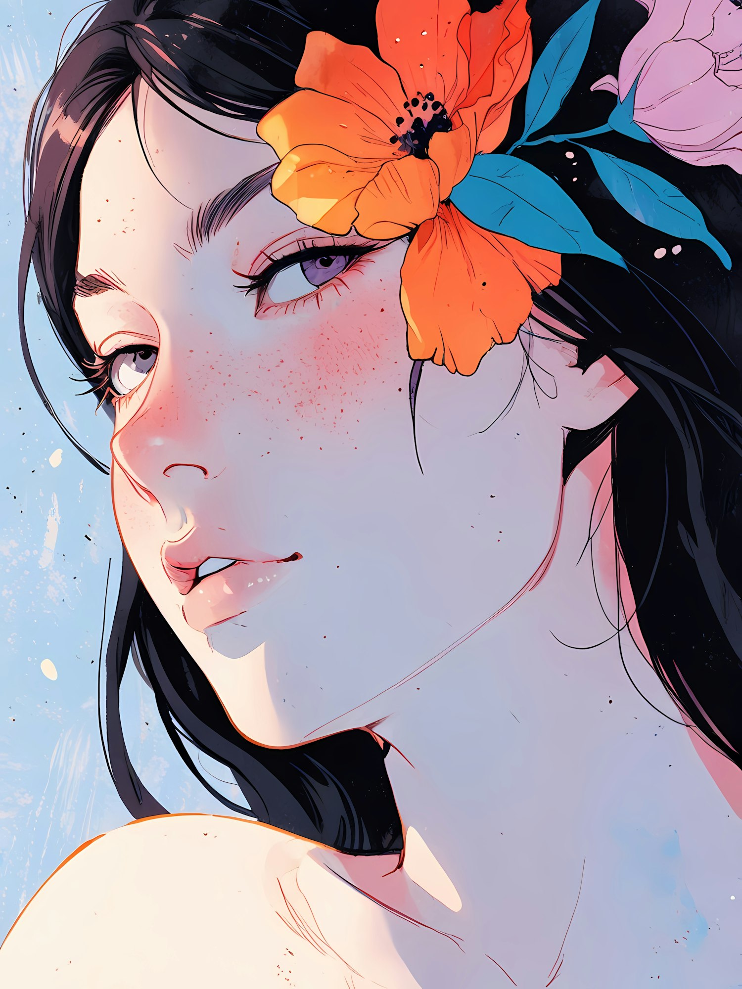 Stylized illustration of a freckled woman with black hair, violet eyes, and vibrant flowers in her hair against a dreamy blue background.