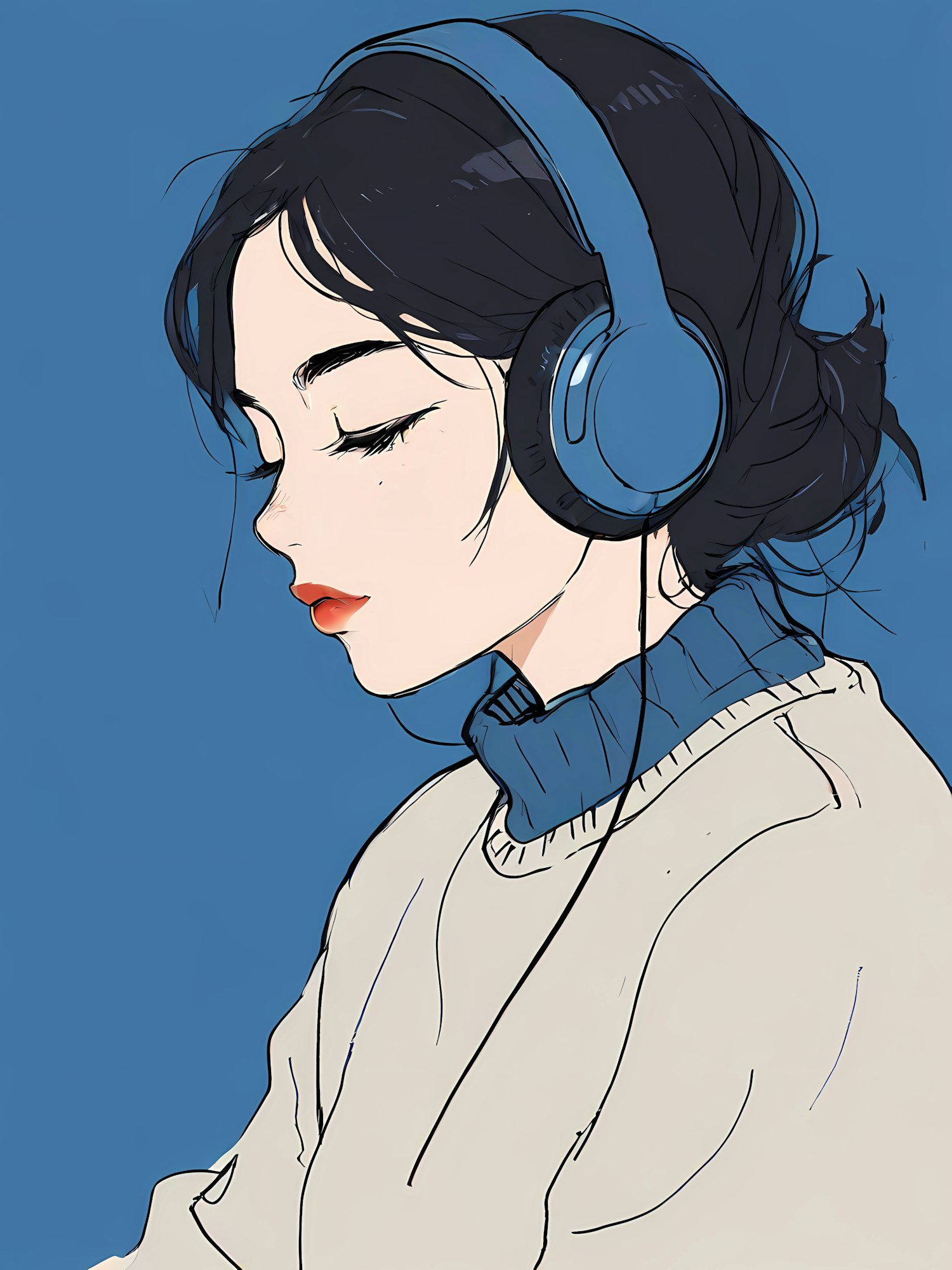 Illustration of a serene woman with headphones, eyes closed, in a beige sweater and blue turtleneck against a blue background.