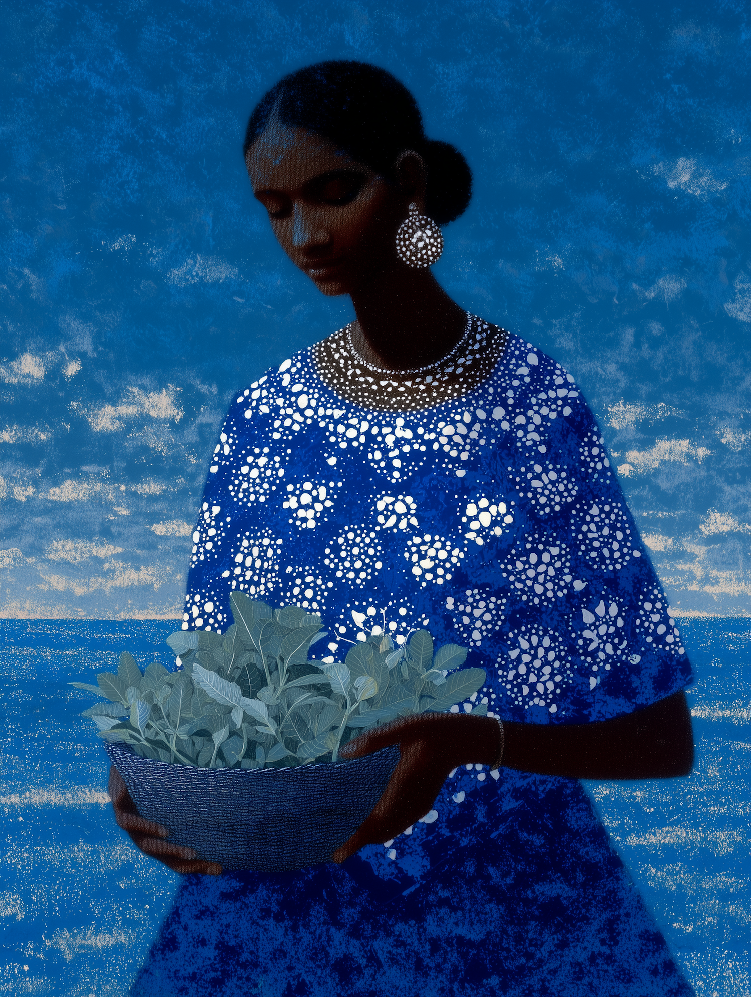 A serene illustration of a woman in a patterned blue dress holding a bowl of green leaves, set against a textured blue background.