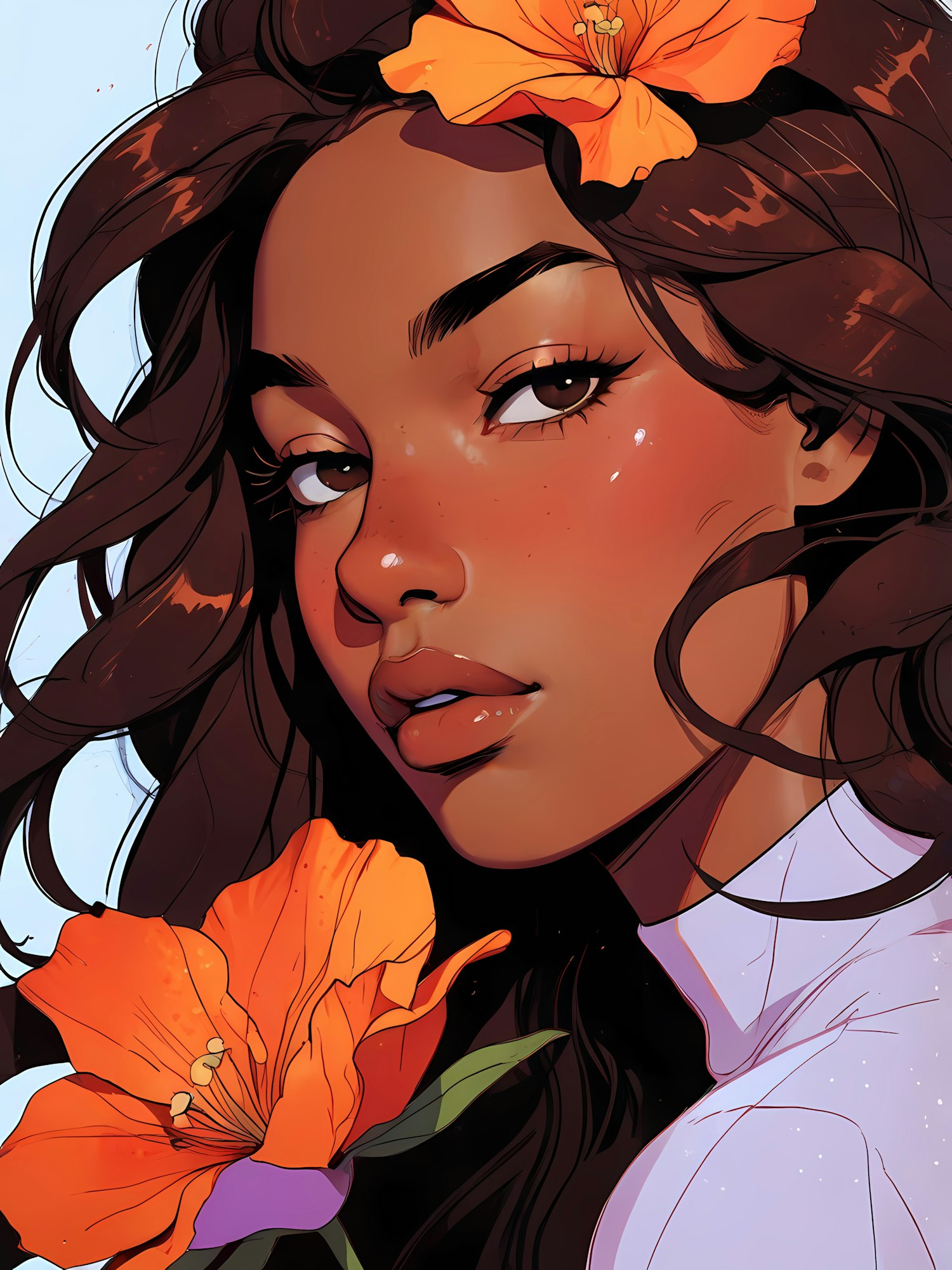 Illustration of a woman with dark brown skin and orange flowers in her hair, set against a light blue background.