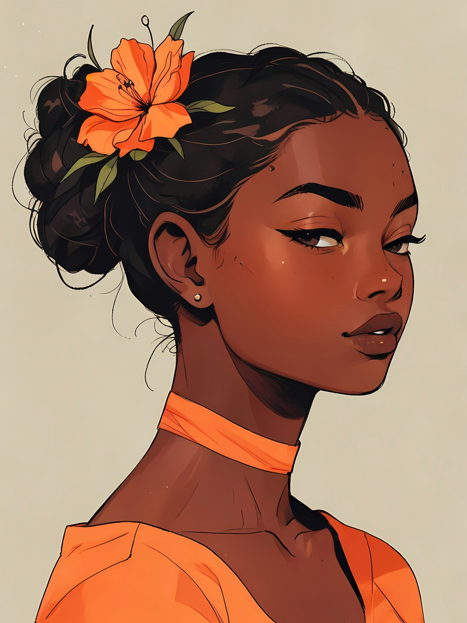 Illustration of a young Black woman with an orange hibiscus in her hair, wearing an orange choker and top, exuding elegance and confidence.