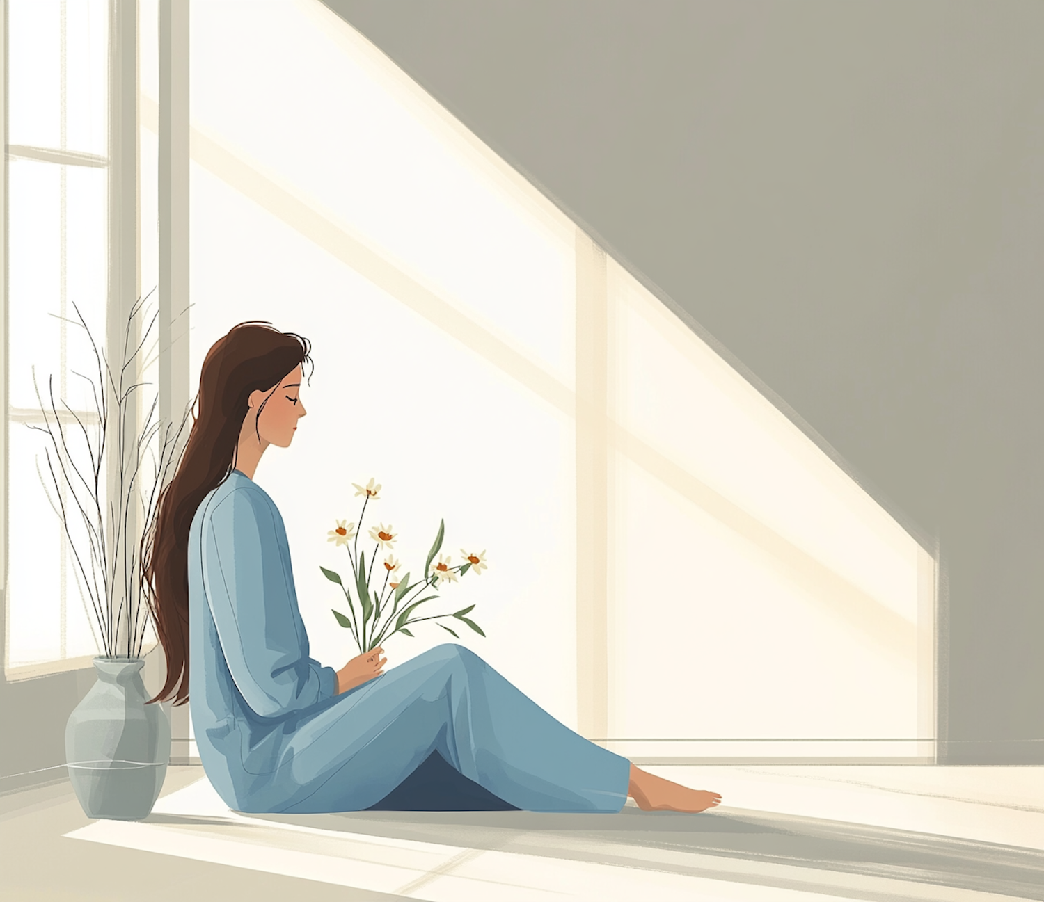 Illustration of a woman in a sunlit room holding flowers, exuding peace and tranquility. Soft colors and gentle light create a serene mood.
