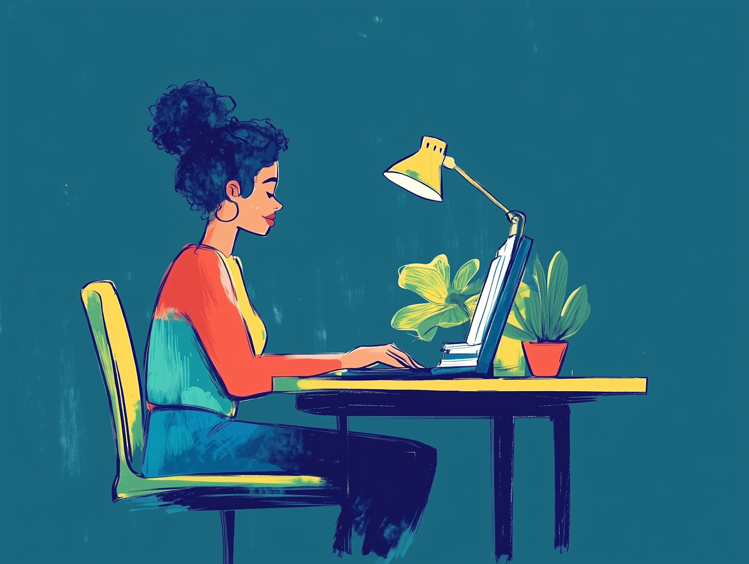 Illustration of a woman working on a laptop at a desk with a colorful sweater and a potted plant, set against a teal background.