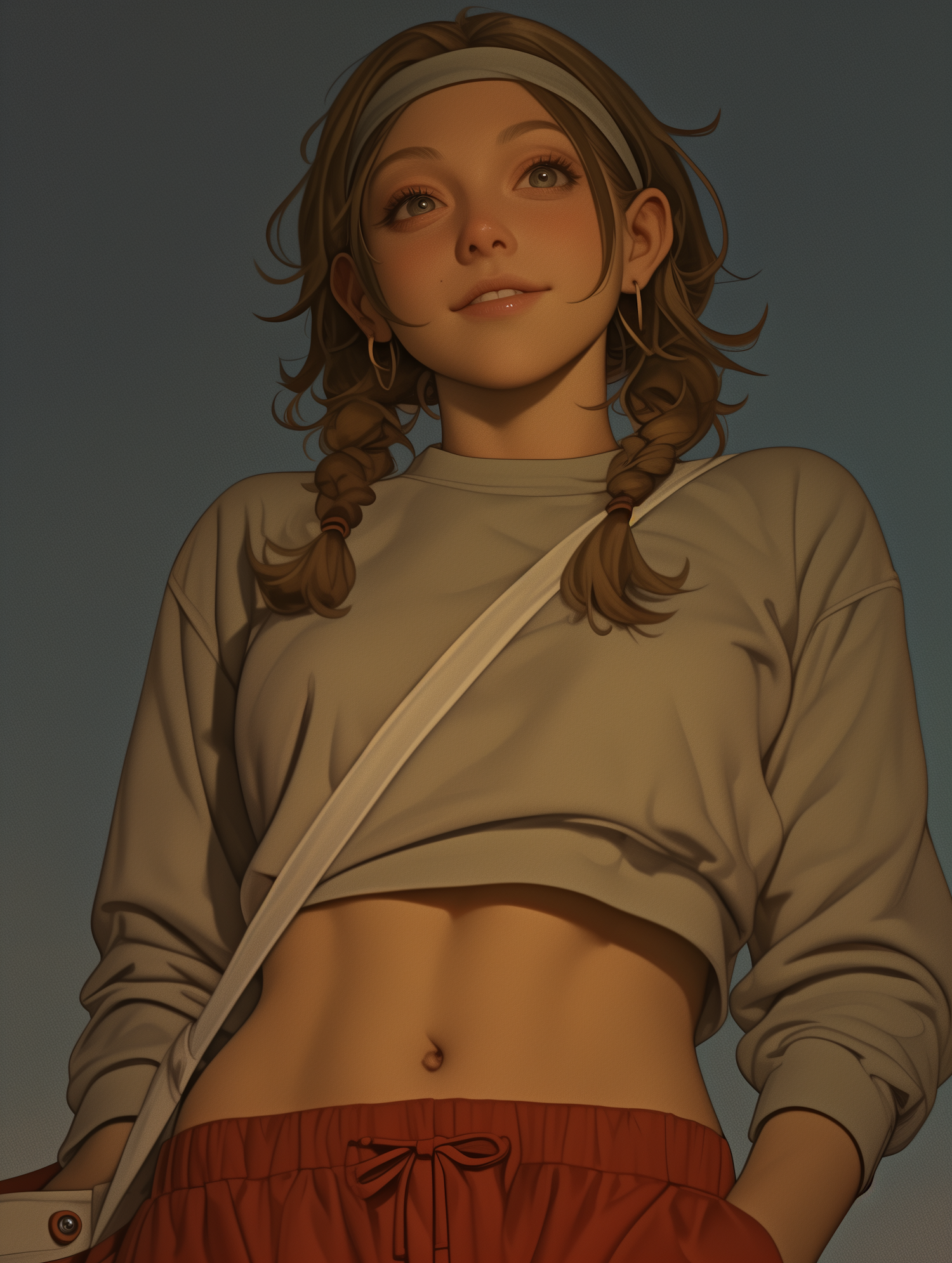 Young woman with braids in a cropped sweatshirt and red pants, exuding confidence and style against a soft blue background.