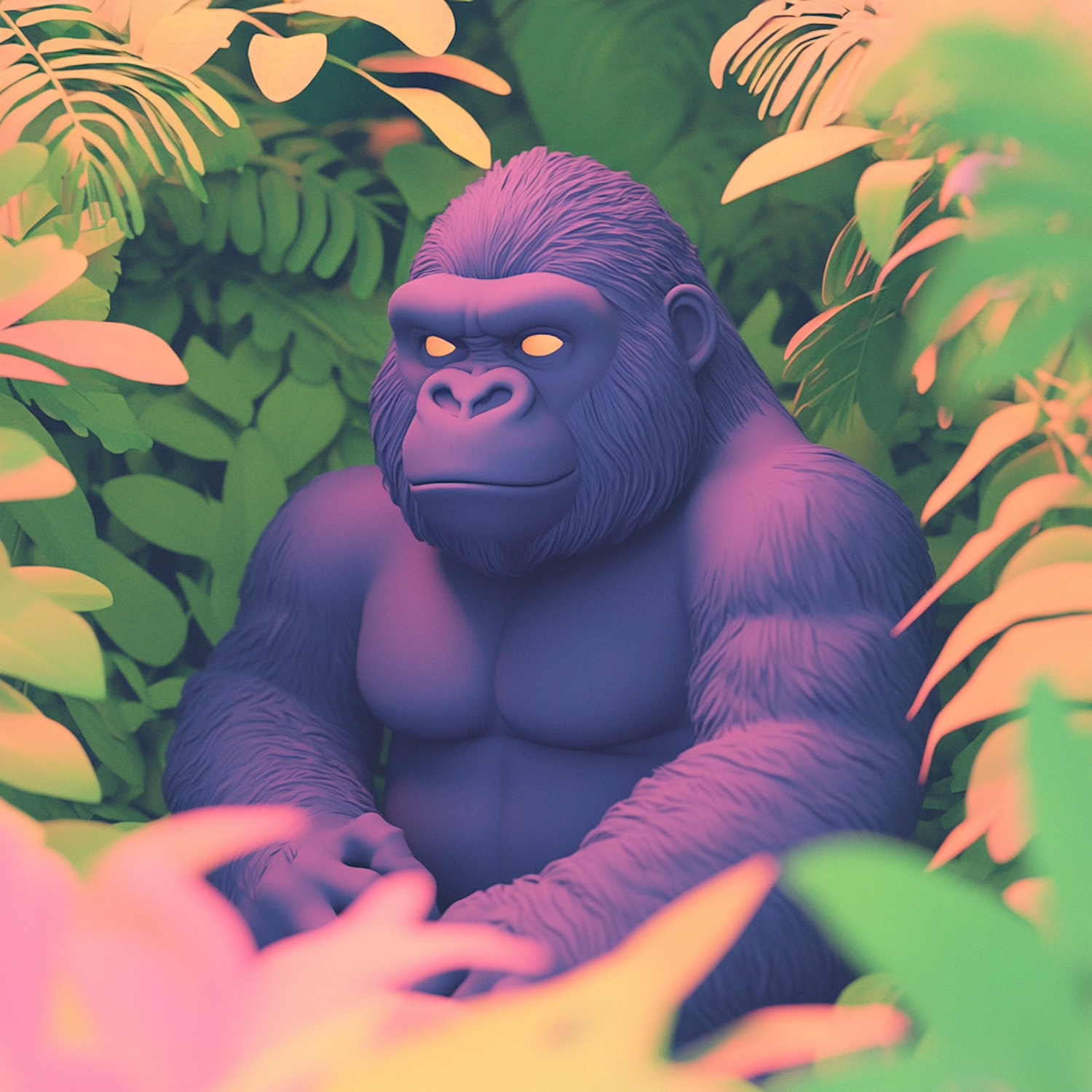 Vibrant 3D illustration of a purple gorilla with glowing eyes in a colorful jungle setting, blending natural and surreal elements.