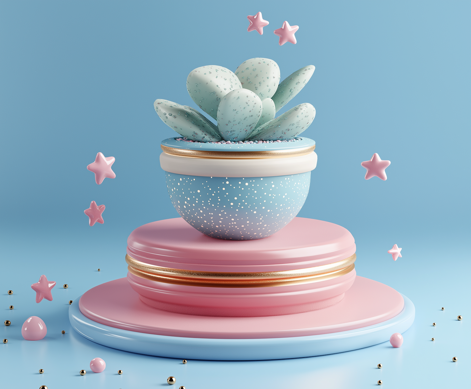 Whimsical 3D illustration of a pastel succulent in a speckled pot, surrounded by floating stars and golden spheres on pink and blue platforms.