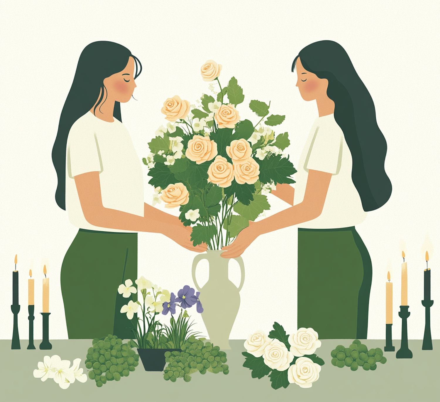 Two women arrange a bouquet of yellow roses on a table with flowers, grapes, and candles, creating a serene and harmonious scene.