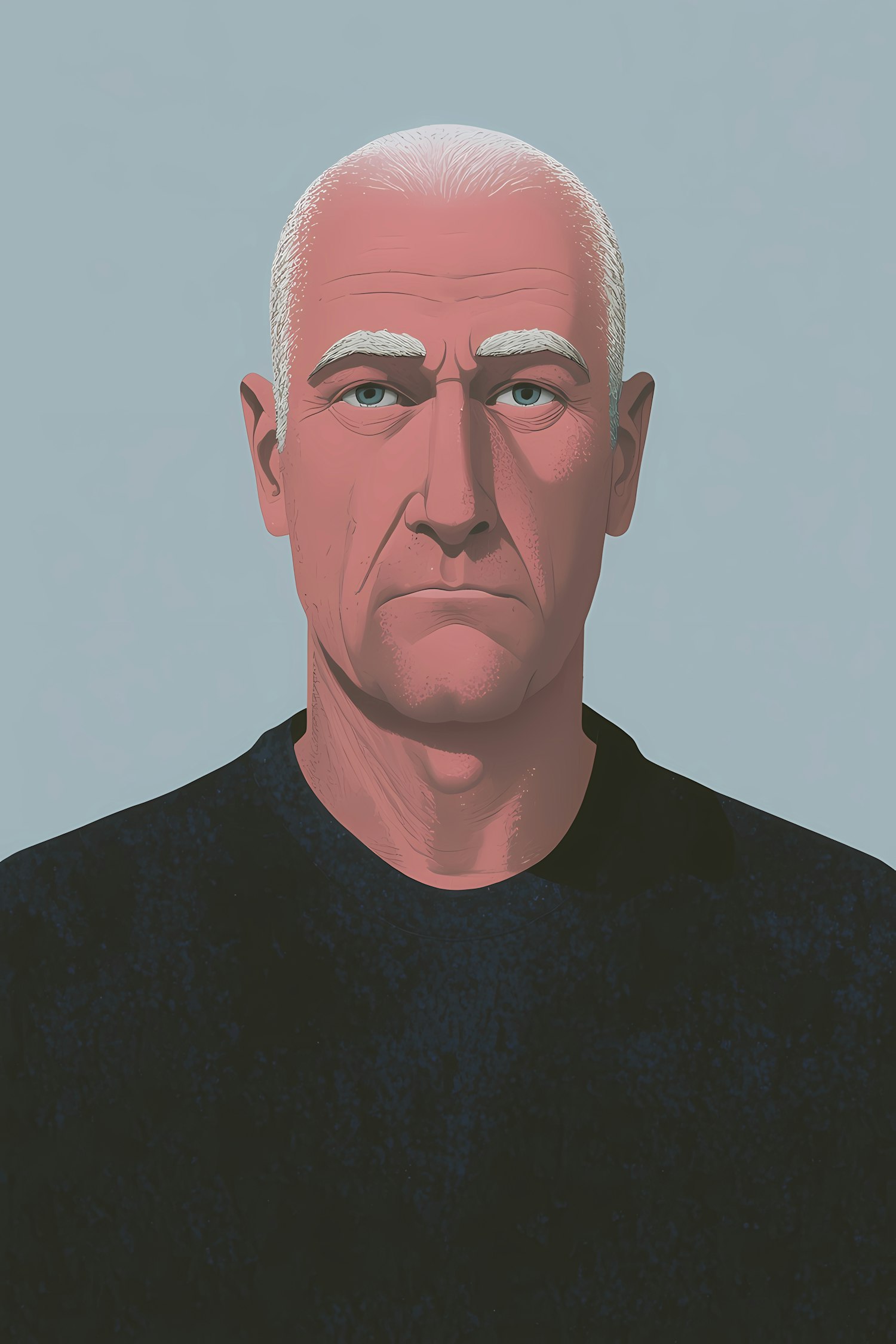 Digital illustration of a serious-looking man with white eyebrows, light skin, and a dark shirt against a light blue background.