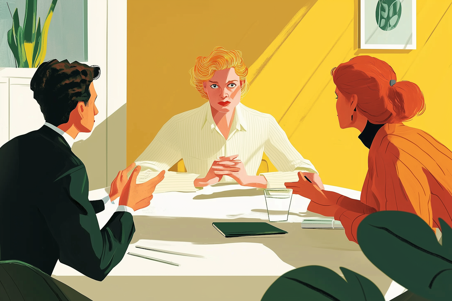 Three people in a serious discussion at a table, with a bright yellow background and a professional setting.