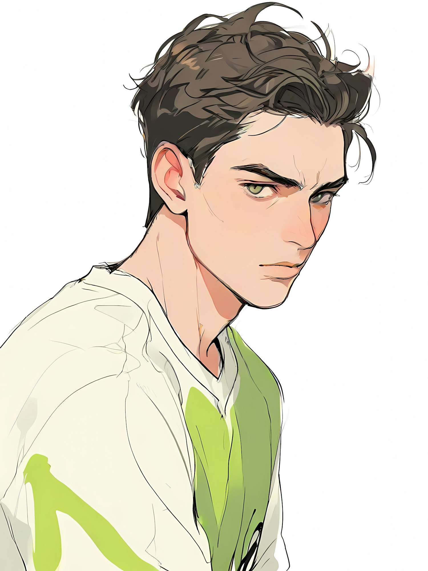 Stylish illustration of a young man with tousled dark hair, green eyes, and a white shirt with green accents, set against a plain white background.