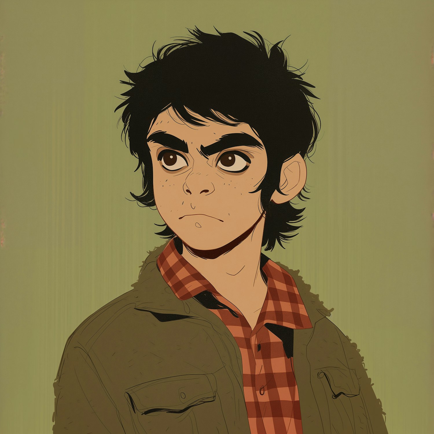 Illustration of a determined young boy with tousled black hair, wearing a checkered shirt and green jacket against a green background.