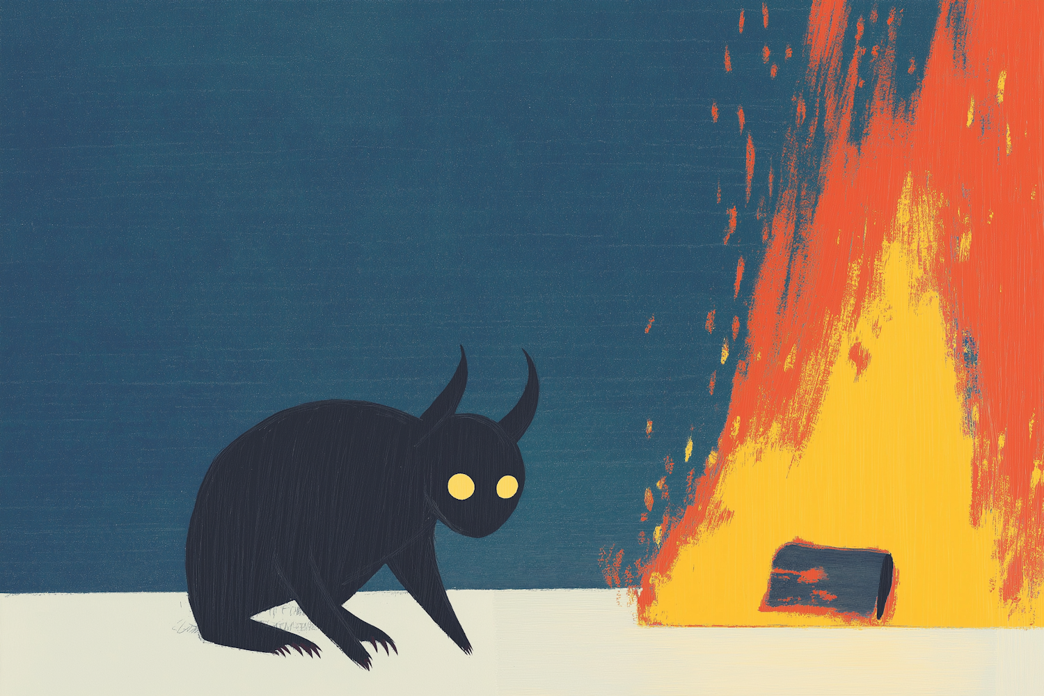 A shadowy creature with glowing eyes stares at a vibrant fire, set against a deep blue background. Minimalistic and striking illustration.