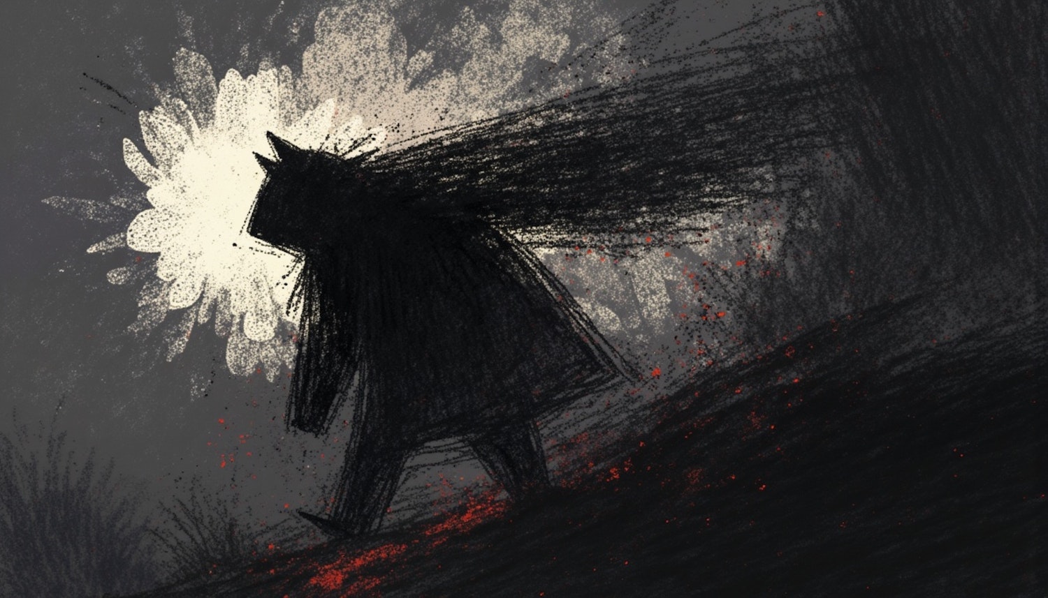 Abstract illustration of a shadowy figure walking on a dark slope, with a bright light behind and red accents adding a mysterious touch.