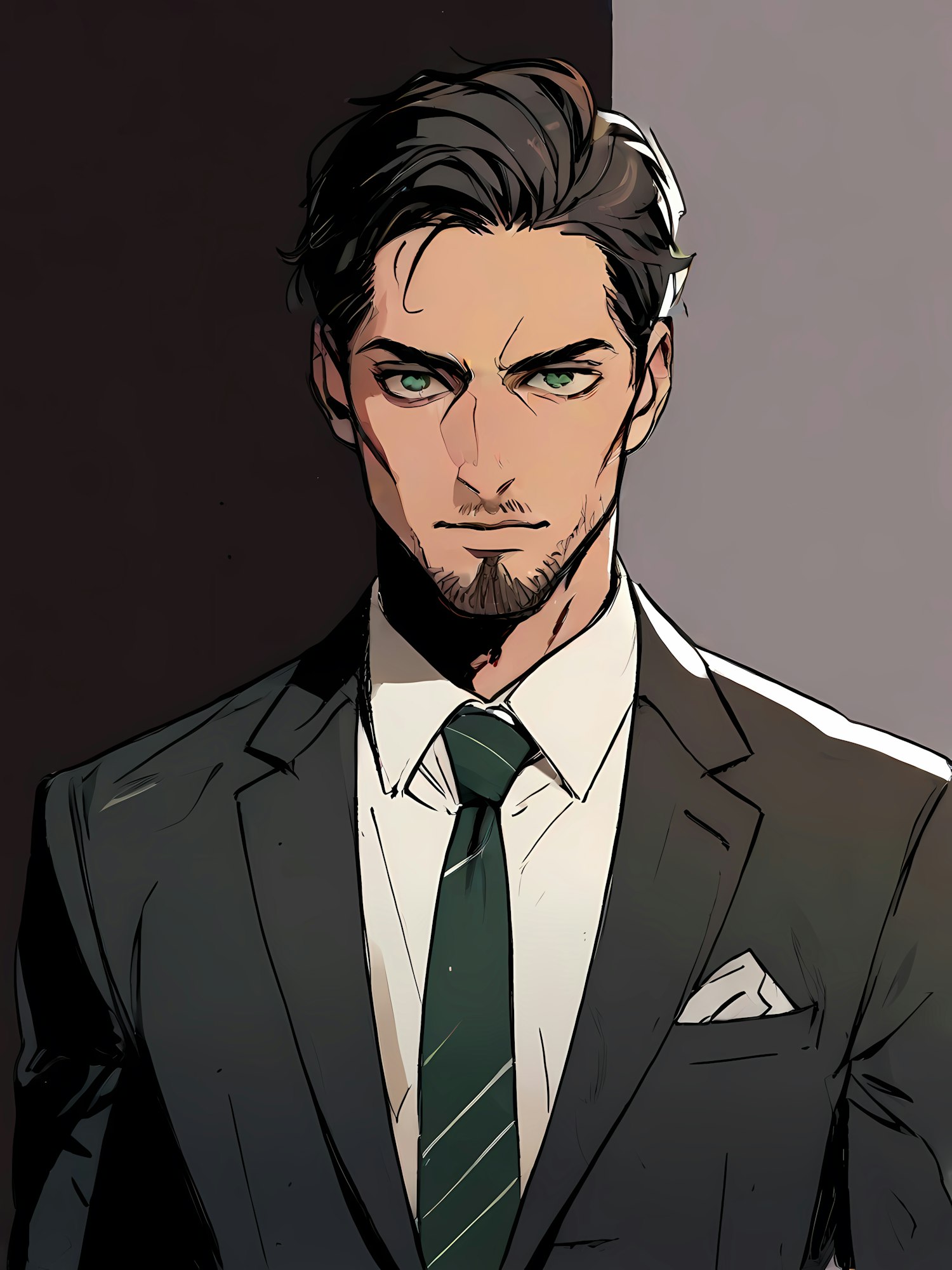 Stylish man in a suit with green eyes and dark hair, exuding confidence and sophistication against a contrasting background.